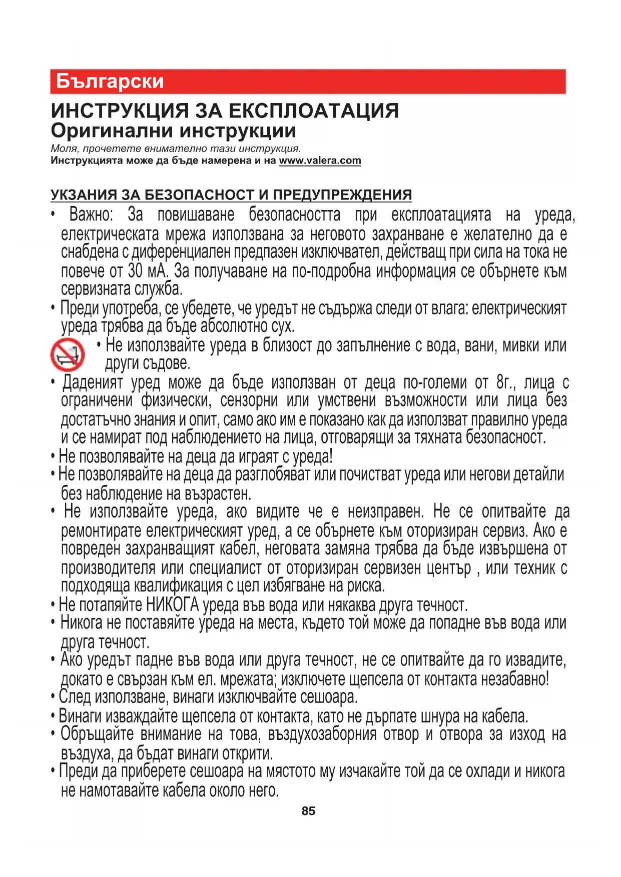 ИНСТРУКЦИЯ ЗА ЕКСПЛОАТАЦИЯ Оригинални инструкции Моля, прочетете внимателно тази инструкция. Инструкцията може да бъде намерена и на www.valera.com