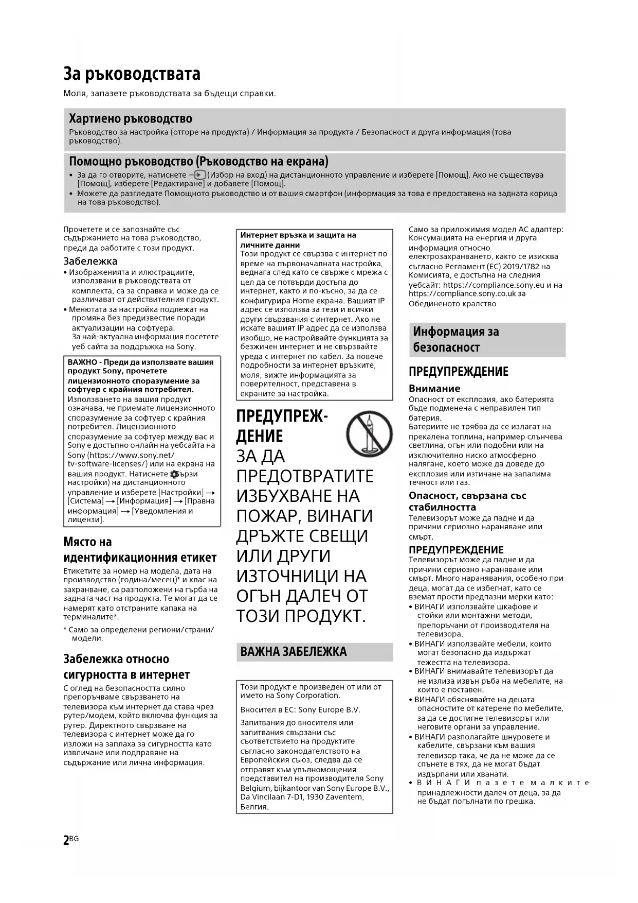 Опасност от експлозия, ако батерията бъде подменена с неправилен тип батерия.Батериите не трябва да се излагат на прекалена топлина, например слънчева светлина, огън или подобни или на изключително ниско атмосферно налягане, което може да доведе до експлозия или изтичане на запалима течност или газ. Опасност, свързана със стабилността Телевизорът може да падне и да причини сериозно нараняване или смърт. ПРЕДУПРЕЖДЕНИЕ Телевизорът може да падне и да причини сериозно нараняване или смърт. Много наранявания, особено при деца, могат да се избегнат, като се вземат прости предпазни мерки като:• ВИНАГИ използвайте шкафове и стойки или монтажни методи, препоръчани от производителя на телевизора.• ВИНАГИ използвайте мебели, които могат безопасно да издържат тежестта на телевизора.• ВИНАГИ внимавайте телевизорът да не излиза извън ръба на мебелите, на които е поставен.• ВИНАГИ обяснявайте на децата опасностите от катерене по мебелите, за да се достигне телевизорът или неговите органи за управление.• ВИНАГИ разполагайте шнуровете и кабелите, свързани към вашия телевизор така, че да не може да се спънете в тях, да не могат бъдат издърпани или хванати.•ВИНАГИ пазете малките принадлежности далеч от деца, за да не бъдат погълнати по грешка. За ръководствата Моля, запазете ръководствата за бъдещи справки. Хартиено ръководство Ръководство за настройка (отгоре на продукта) / Информация за продукта / Безопасност и друга информация (това ръководство). Помощно ръководство (Ръководство на екрана)