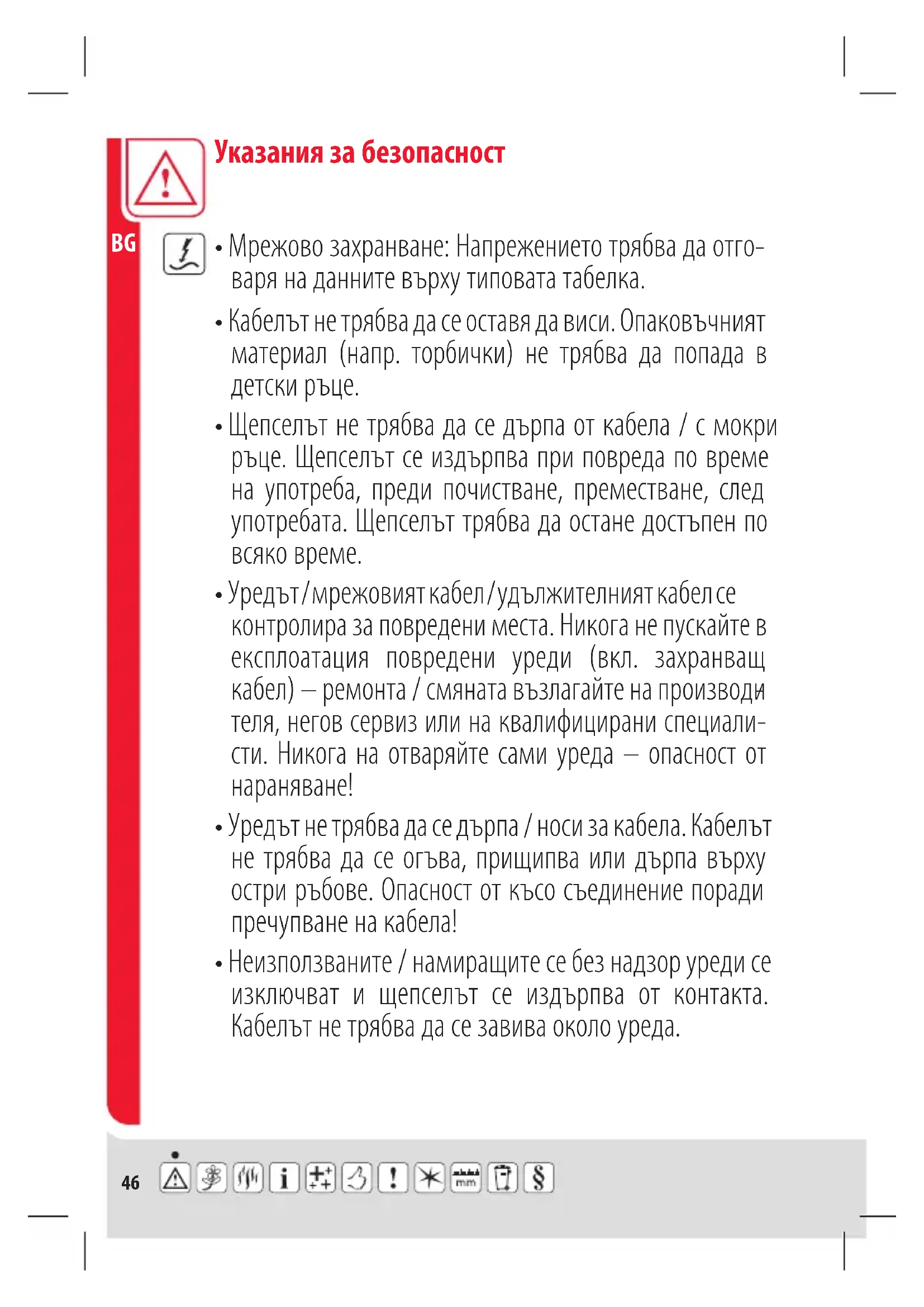 - Деца не бива да играят с уреда. Дръжте уреда и захранващия кабел далеч от деца под 8 години.48 Указания за безопасност