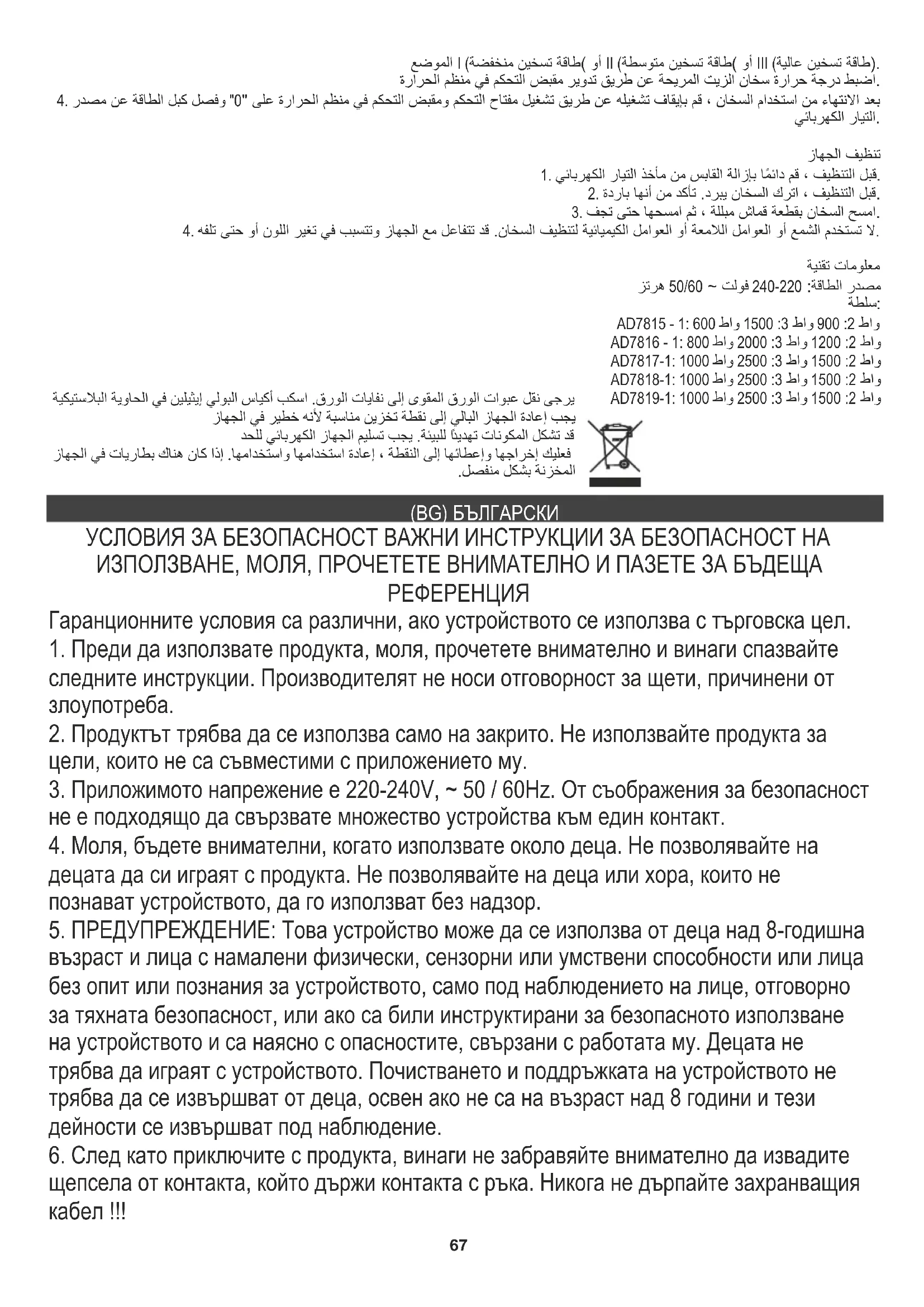 AD7815 – 1: 600 W 2: 900 W 3: 1500 W AD7816 – 1: 800 W 2: 1200 W 3: 2000 W AD7817 – 1: 1000 W 2: 1500 W 3: 2500 W Ad7818 – 1: 1000 W 2: 1500 W 3: 2500 W Ad7819 – 1: 1000 W 2: 1500 W 3: 2500 W Моля, прехвърлете картонените опаковки в отпадъчна хартия. Изсипете полиетиленовите торбички (PE) в пластмасовия контейнер. Износеното устройство трябва да се върне в съответното място за съхранение, тъй като е опасно в устройството съставките могат да представляват заплаха за околната среда. Електрическото устройство трябва да бъде предадено докрай повторното му използване и използване. Ако в устройството има батерии, трябва да извадите и да дадете на точката, съхранявана отделно. (AZ) AZRBAYCAN TƏHLÜKƏSİZLİK ŞƏRTLƏRİ İSTİFADƏ TƏHLÜKƏSİZLİĞİ ÜZRƏ VACİB TƏLİMATLARI DİQQƏTLƏ OXUYUN VƏ GƏLƏCƏK İSTİFADƏ ÜÇÜN SAXLAYIN. Cihaz kommersiya məqsədləri üçün istifadə olunarsa, zəmanət şərtləri fərqlidir.