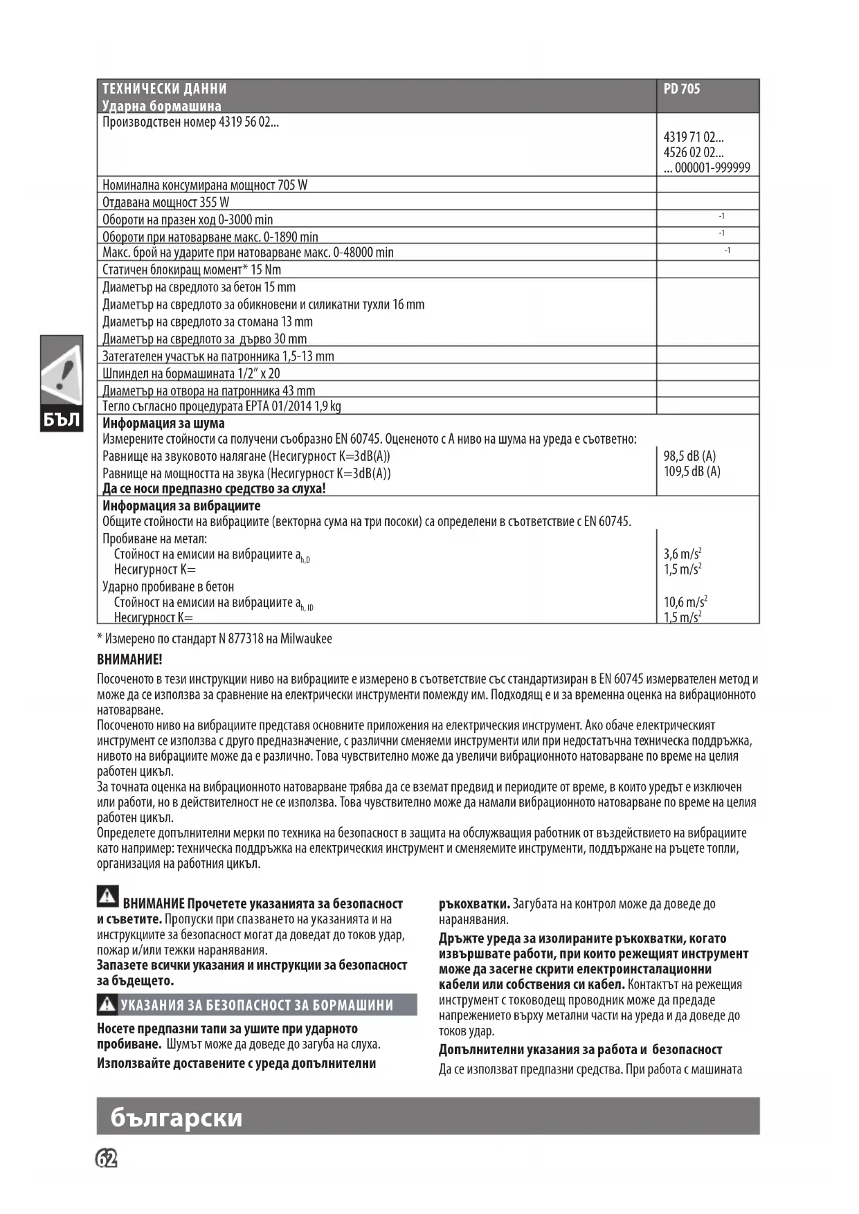 Статичен блокиращ момент* 15 Nm Диаметър на свредлото за бетон 15 mm Диаметър на свредлото за обикновени и силикатни тухли 16 mm Диаметър на свредлото за стомана 13 mm Диаметър на свредлото за дърво 30 mm Затегателен участък на патронника 1,5-13 mm Шпиндел на бормашината 1/2” x 20 Диаметър на отвора на патронника 43 mm Тегло съгласно процедурата EPTA 01/2014 1,9 kg Информация за шума Измерените стойности са получени съобразно EN 60745. Оцененото с A ниво на шума на уреда е съответно: Равнище на звуковото налягане (Несигурност K=3dB(A)) Равнище на мощността на звука (Несигурност K=3dB(A)) Да се носи предпазно средство за слуха! 98,5 dB (A) 109,5 dB (A) Информация за вибрациите Общите стойности на вибрациите (векторна сума на три посоки) са определени в съответствие с EN 60745. Пробиване на метал: Стойност на емисии на вибрациите a h,D Несигурност K= 3,6 m/s