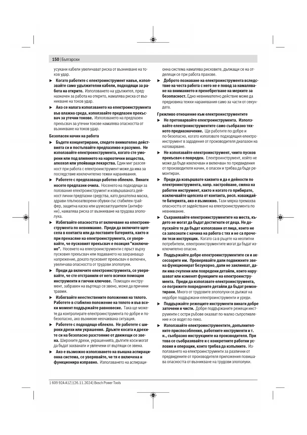 Безопасност на работното място u Пазете работното си място чисто и добре осветено. Разхвърляните или тъмни работни места са предпос- тавка за инциденти. u Не работете с електроинструмента в среда с пови- шена опасност от възникване на експлозия, в бли- зост до леснозапалими течности, газове или прахо- образни материали. По време на работа в електроин- струментите се отделят искри, които могат да възпла- менят прахообразни материали или пари. u Дръжте деца и странични лица на безопасно разсто- яние, докато работите с електроинструмента. Ако вниманието Ви бъде отклонено, може да загубите кон- трола над електроинструмента. Безопасност при работа с електрически ток u Щепселът на електроинструмента трябва да е под- ходящ за ползвания контакт. В никакъв случай не се допуска изменяне на конструкцията на щепсе- ла. Когато работите със занулени електроуреди, не използвайте адаптери за щепсела. Ползването на оригинални щепсели и контакти намалява риска от възникване на токов удар. u Избягвайте допира на тялото Ви до заземени тела, напр. тръби, отоплителни уреди, печки и хладилни- ци. Когато тялото Ви е заземено, рискът от възникване на токов удар е по‑голям. u Предпазвайте електроинструмента си от дъжд и влага. Проникването на вода в електроинструмента повишава опасността от токов удар. u Не използвайте захранващия кабел за цели, за кои- то той не е предвиден. Никога не използвайте зах- ранващия кабел за пренасяне, теглене или откача- ване на електроинструмента. Предпазвайте кабела от нагряване, омасляване, допир до остри ръбове или до подвижни звена на машини. Повредени или Bosch Power Tools 1 609 92A A1Z | (26.11.2024)150 | Български усукани кабели увеличават риска от възникване на то-