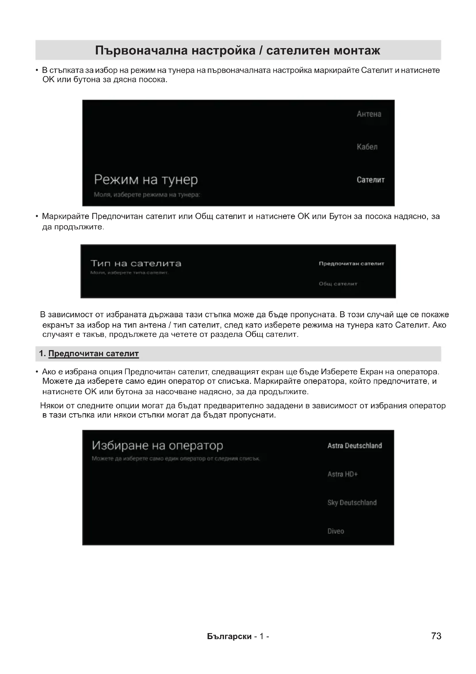 - Ако е избрана опция Предпочитан сателит, следващият екран ще бъде Изберете Екран на оператора. Можете да изберете само един оператор от списъка. Маркирайте оператора, който предпочитате, и натиснете OK или бутона за насочване надясно, за да продължите. Някои от следните опции могат да бъдат предварително зададени в зависимост от избрания оператор в тази стъпка или някои стъпки могат да бъдат пропуснати. 73Български - 2 - 1.1. Тип антена - Директна