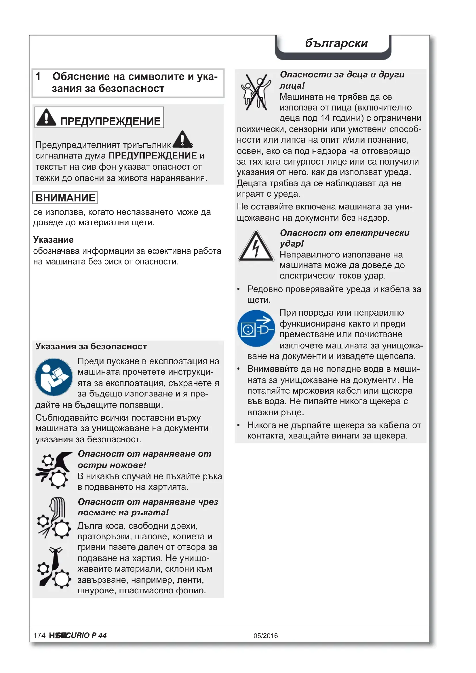 обозначава информации за ефективна работа на машината без риск от опасности. ПРЕДУПРЕЖДЕНИЕ Предупредителният триъгълник със сигналната дума ПРЕДУПРЕЖДЕНИЕ и текстът на сив фон указват опасност от тежки до опасни за живота наранявания. Указания за безопасност Преди пускане в експлоатация на машината прочетете инструкци- ята за експлоатация, съхранете я за бъдещо използване и я пре- дайте на бъдещите ползващи. Съблюдавайте всички поставени върху машината за унищожаване на документи указания за безопасност. Опасност от нараняване от остри ножове! В никакъв случай не пъхайте ръка