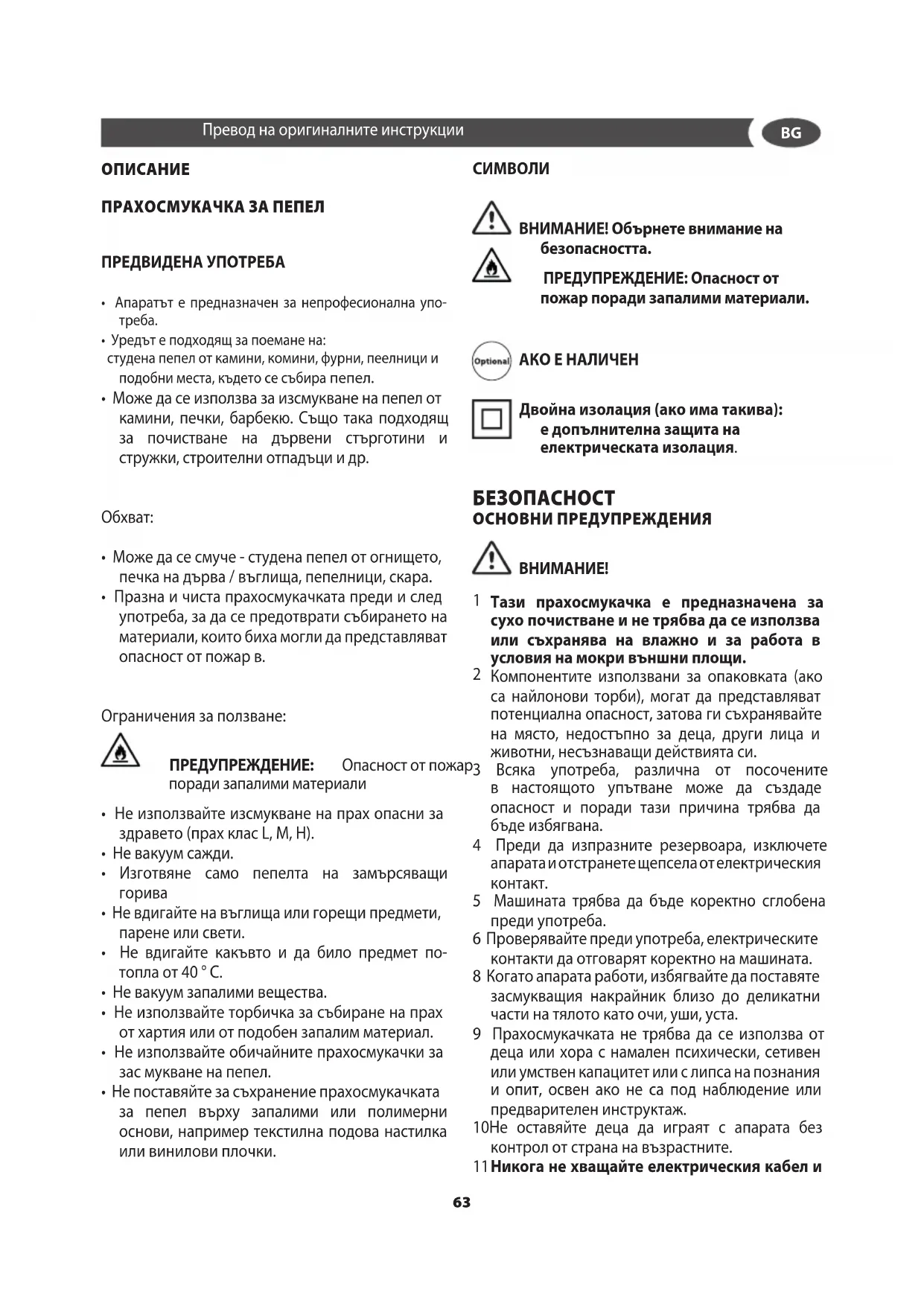 - Не използвайте обичайните прахосмукачки за зас мукване на пепел.
