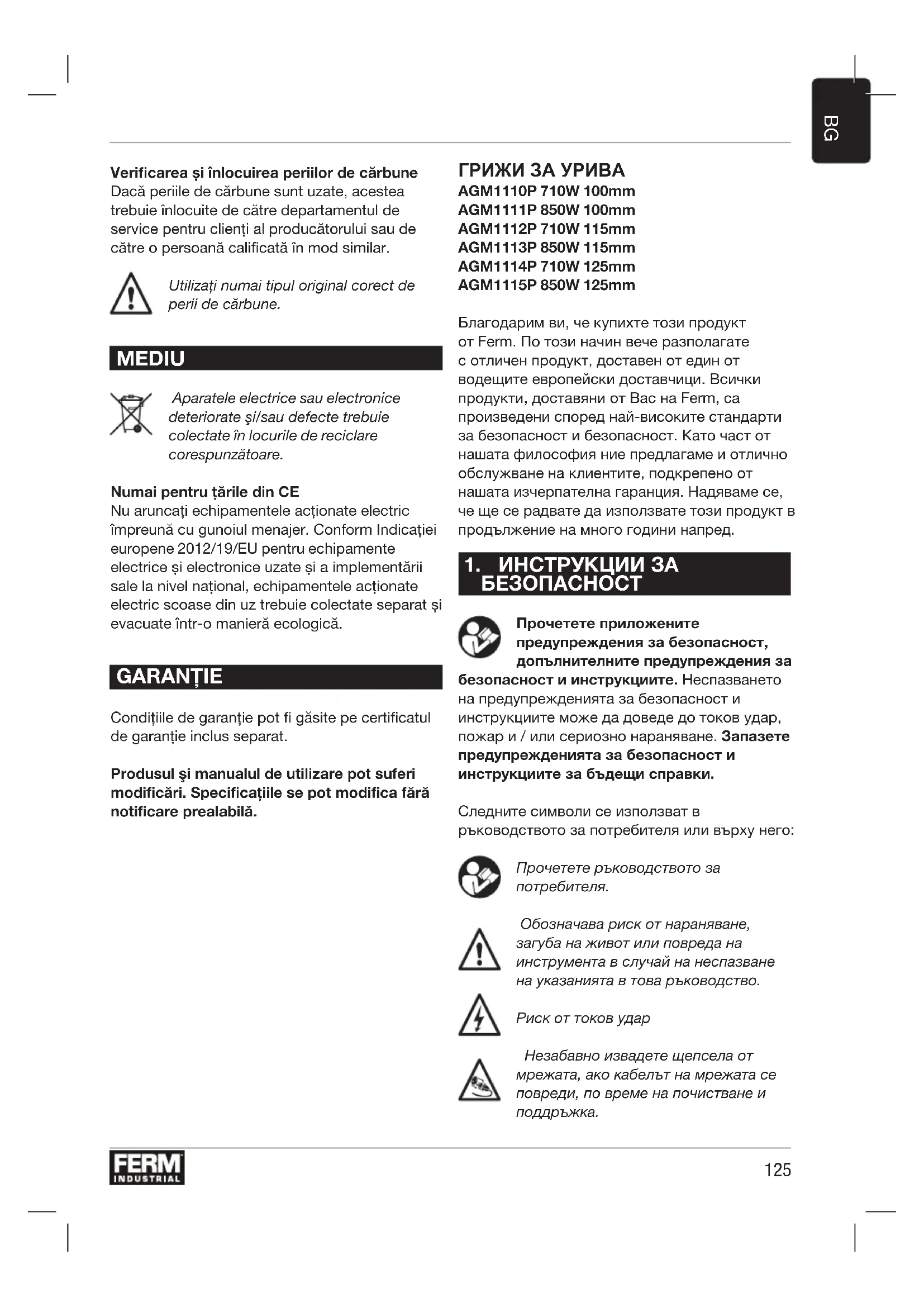 ГРИЖИ ЗА УРИВА AGM1110P 710W 100mm AGM1111P 850W 100mm AGM1112P 710W 115mm AGM1113P 850W 115mm AGM1114P 710W 125mm AGM1115P 850W 125mm Благодарим ви, че купихте този продукт от Ferm. По този начин вече разполагате с отличен продукт, доставен от един от водещите европейски доставчици. Всички продукти, доставяни от Вас на Ferm, са произведени според най-високите стандарти за безопасност и безопасност. Като част от нашата философия ние предлагаме и отлично обслужване на клиентите, подкрепено от нашата изчерпателна гаранция. Надяваме се, че ще се радвате да използвате този продукт в продължение на много години напред.