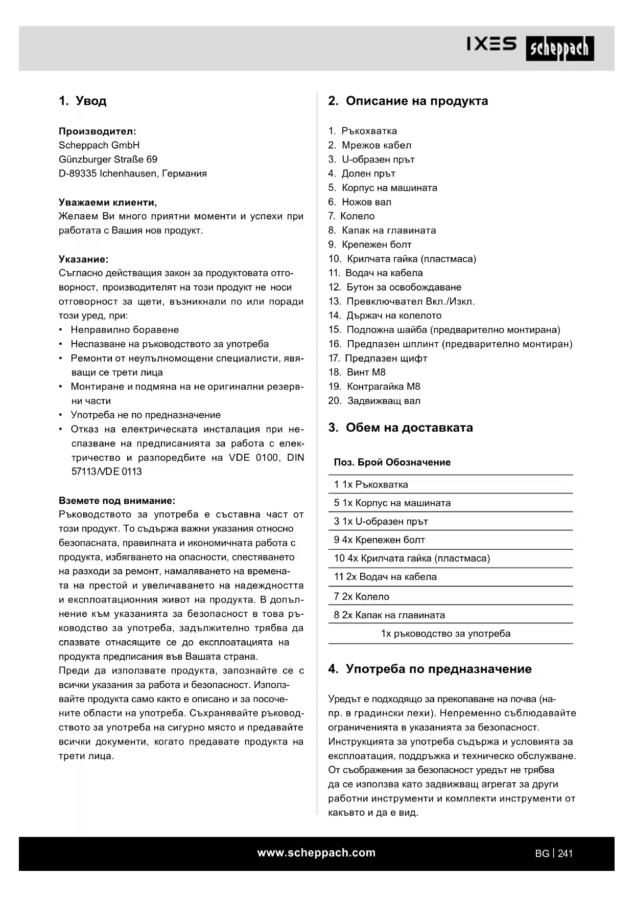 - Отказ на електрическата инсталация при не- спазване на предписанията за работа с елек- тричество и разпоредбите на VDE 0100, DIN 57113/VDE 0113 Вземете под внимание: Ръководството за употреба е съставна част от този продукт. То съдържа важни указания относно безопасната, правилната и икономичната работа с продукта, избягването на опасности, спестяването на разходи за ремонт, намаляването на времена- та на престой и увеличаването на надеждността и експлоатационния живот на продукта. В допъл- нение към указанията за безопасност в това ръ- ководство за употреба, задължително трябва да спазвате отнасящите се до експлоатацията на продукта предписания във Вашата страна. Преди да използвате продукта, запознайте се с всички указания за работа и безопасност. Използ- вайте продукта само както е описано и за посоче- ните области на употреба. Съхранявайте ръковод- ството за употреба на сигурно място и предавайте всички документи, когато предавате продукта на трети лица.www.scheppach.com
