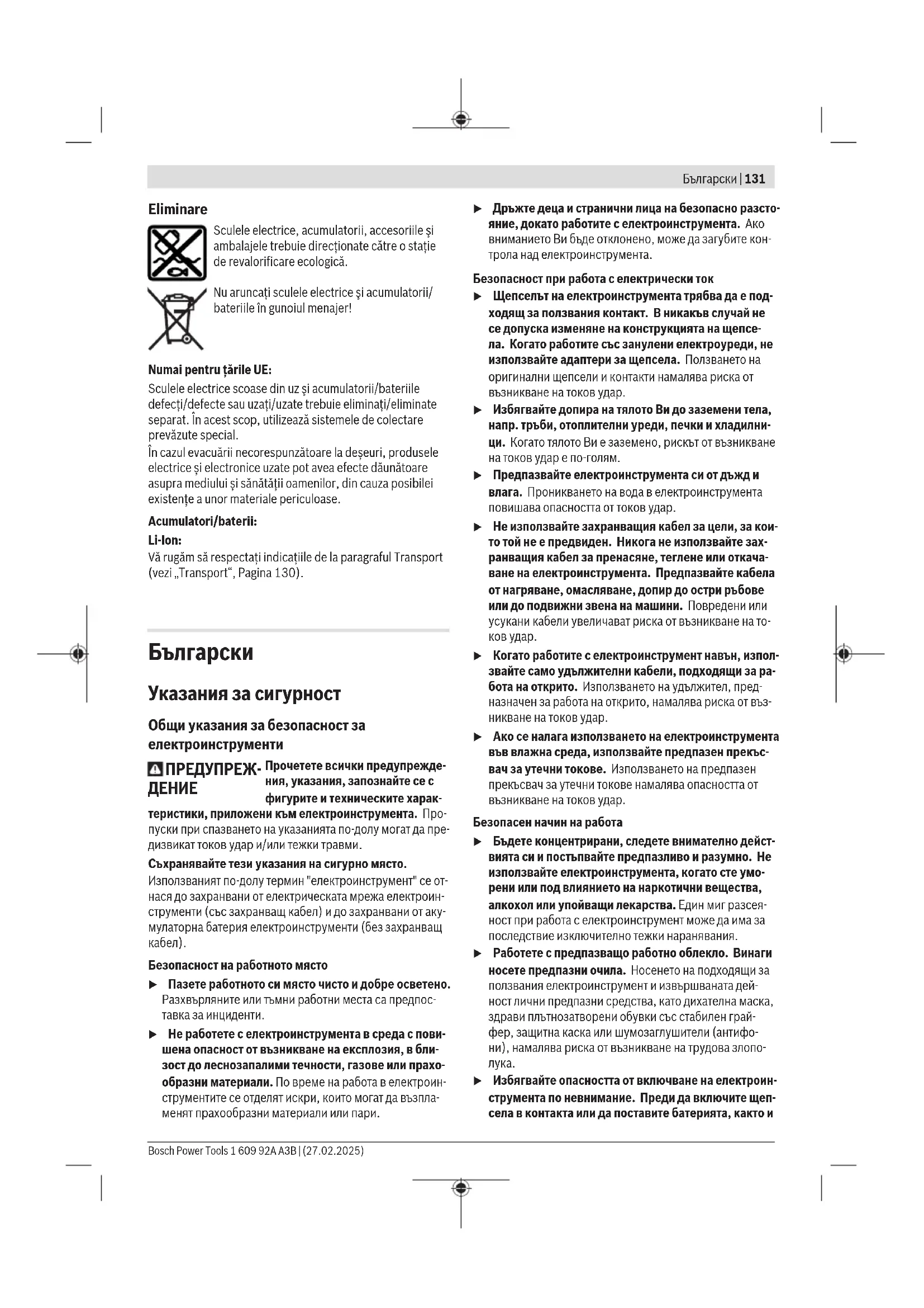 Електроинструментите, акумулаторните ба- терии и допълнителните приспособления трябва да бъдат предавани за оползотворя- ване на съдържащите се в тях суровини. Не изхвърляйте електроинструменти и аку- мулаторни или обикновени батерии при би- товите отпадъци! Само за страни отЕС: Негодните за употреба електроинструменти и дефектните или изразходвани акумулаторни/обикновени батерии трябва да се изхвърлят разделно. Използвайте предвиде- ните системи за събиране. При неправилно изхвърляне излезли от употреба елект- рически и електронни уреди могат да имат вредни ефек- ти върху околната среда и човешкото здраве поради евентуално наличие на опасни вещества. Акумулаторни или обикновени батерии: Литиево-йонни: Моля, спазвайте указанията в раздела Транспортиране (вж. „Транспортиране“, Страница137).