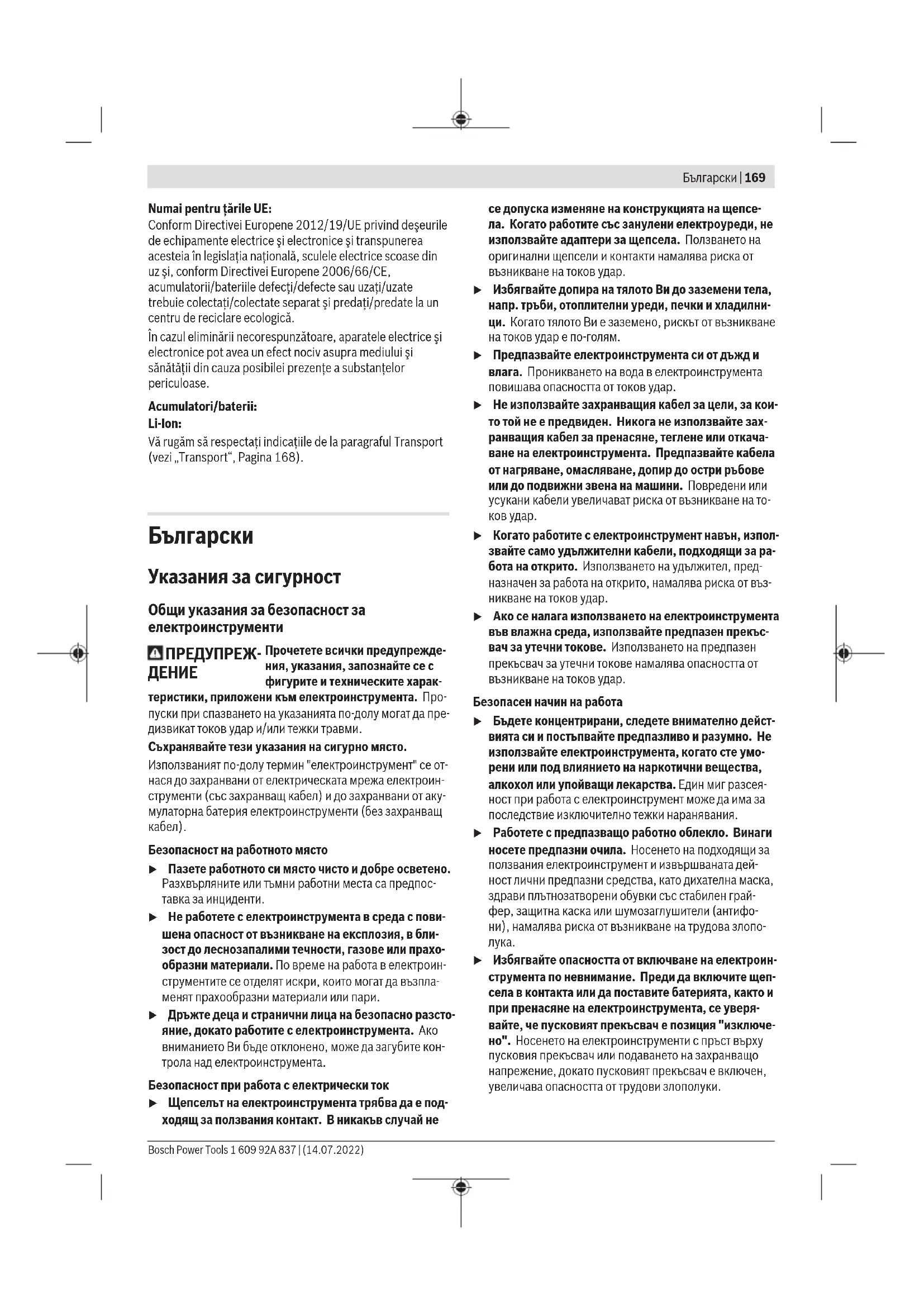 u Избягвайте опасността от включване на електроин- струмента по невнимание. Преди да включите щеп- села в контакта или да поставите батерията, както и при пренасяне на електроинструмента, се уверя- вайте, че пусковият прекъсвач е позиция "изключе- но". Носенето на електроинструменти с пръст върху пусковия прекъсвач или подаването на захранващо напрежение, докато пусковият прекъсвач е включен, увеличава опасността от трудови злополуки. Bosch Power Tools 1 609 92A 837 | (14.07.2022)170 | Български u Преди да включите електроинструмента, се уверя- вайте, че сте отстранили от него всички помощни инструменти и гаечни ключове. Помощен инстру- мент, забравен на въртящо се звено, може да причини