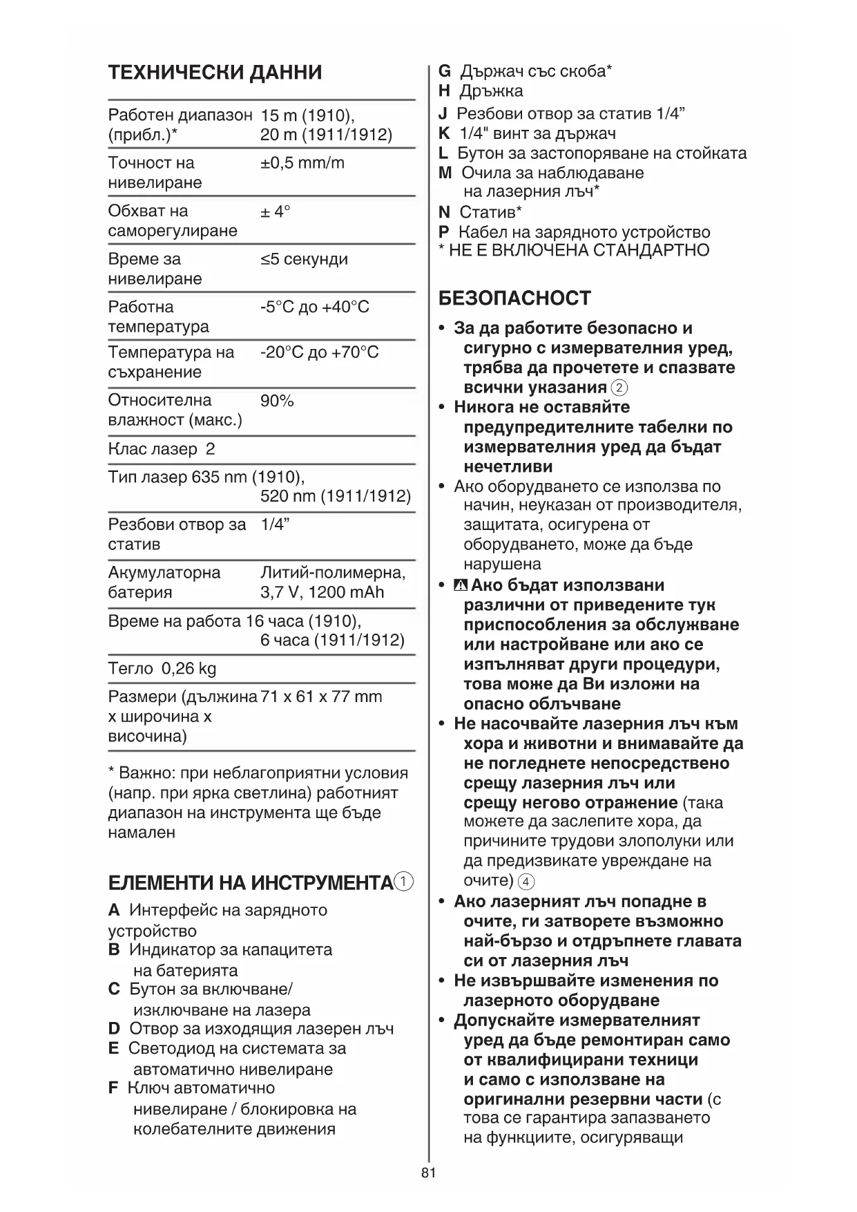 B Индикатор за капацитета на батерията C Бутон за включване/ изключване на лазера D Отвор за изходящия лазерен лъч E Светодиод на системата за автоматично нивелиране F Ключ автоматично нивелиране / блокировка на колебателните движения82 се работи с инструмента в продължение на 30 минути или