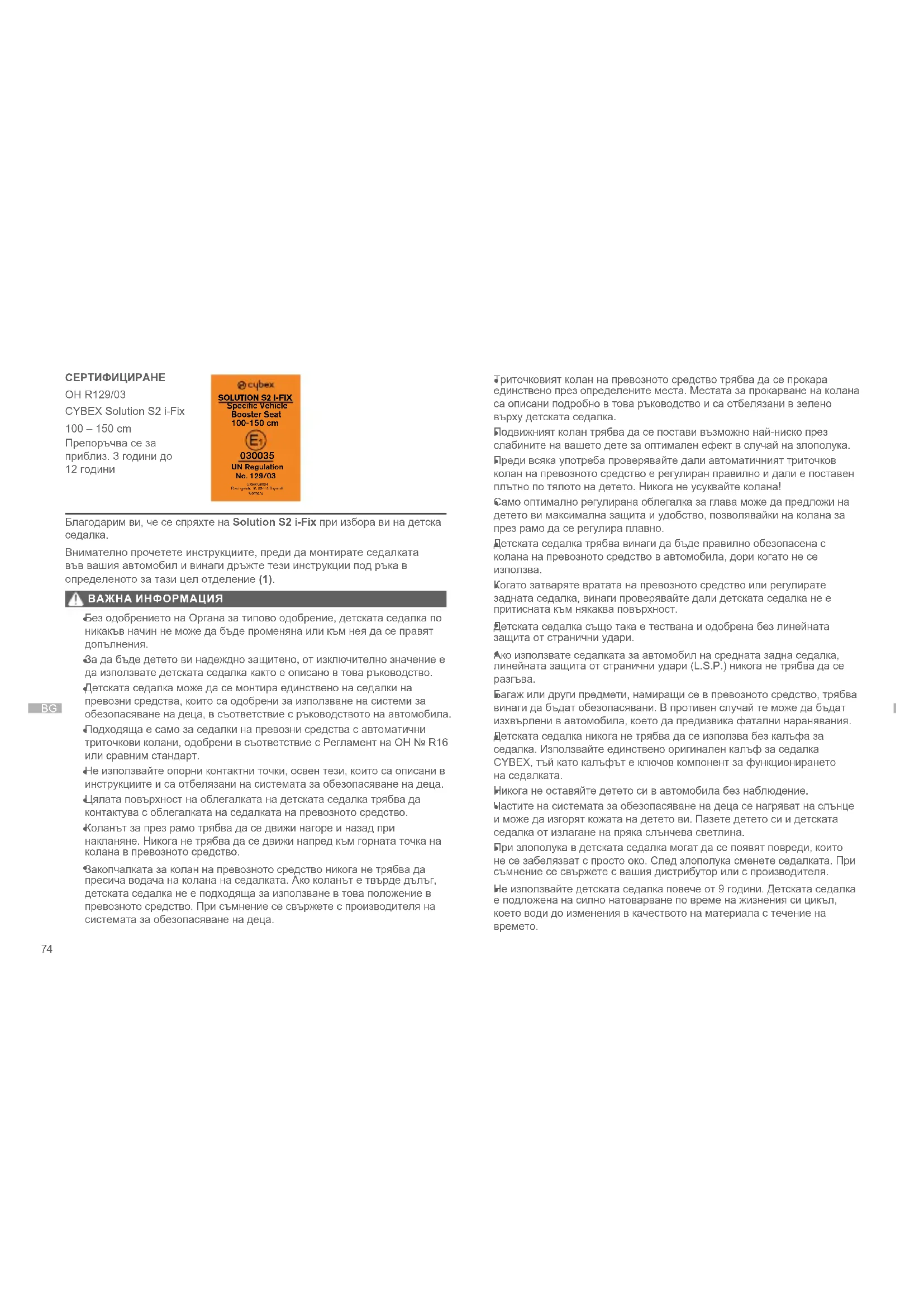 UN RegulationNo. 129/03Cybex GmbHRiedingerstr. 18, 95448 BayreuthGermany СЕРТИФИЦИРАНЕ ОН R129/03 CYBEX Solution S2 i-Fix 100 – 150 cm Препоръчва се за приблиз. 3 години до 12 години