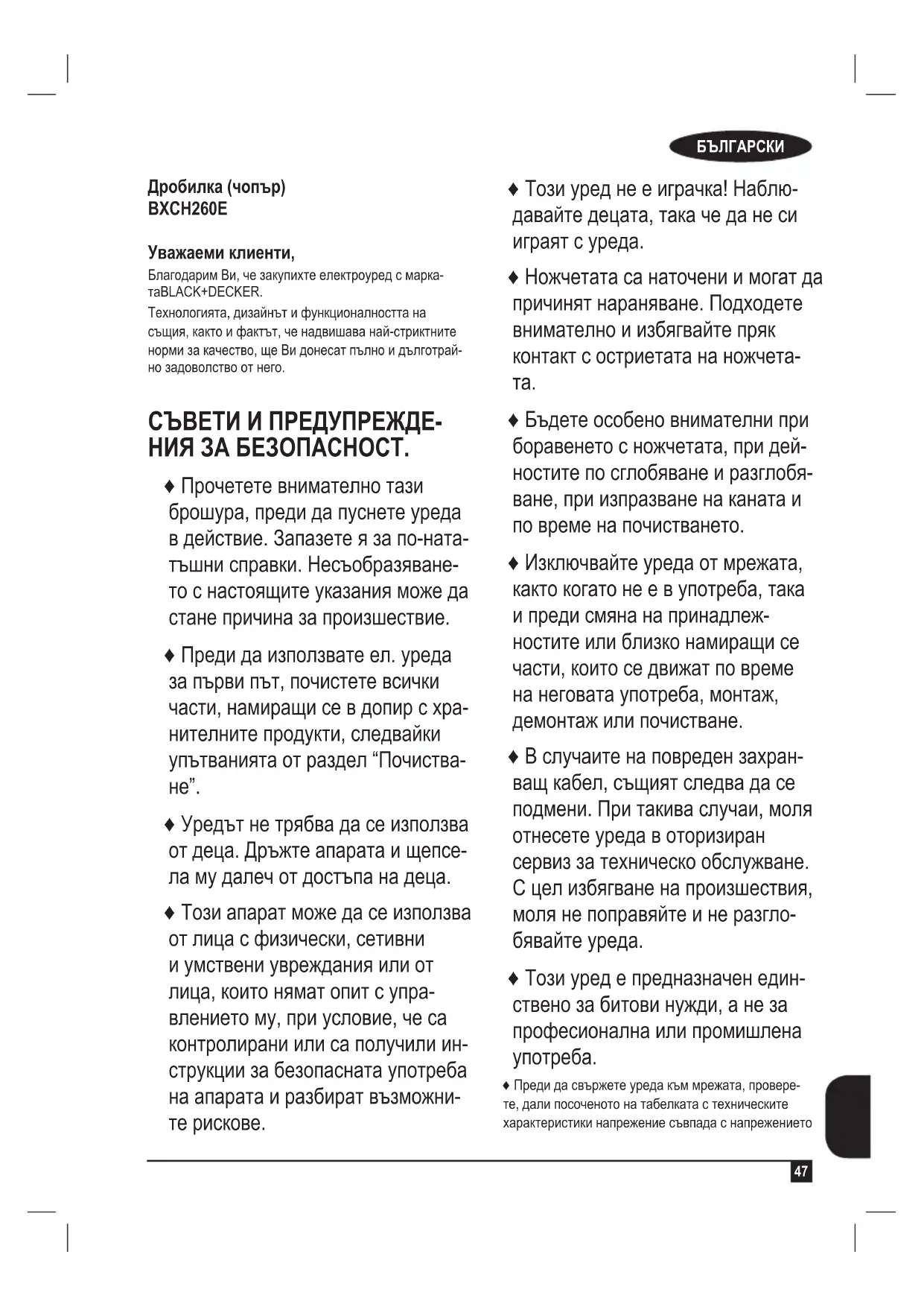 Дробилка (чопър) BXCH260E Уважаеми клиенти, Благодарим Ви, че закупихте електроуред с марка- таBLACK+DECKER. Технологията, дизайнът и функционалността на същия, както и фактът, че надвишава най-стриктните норми за качество, ще Ви донесат пълно и дълготрай- но задоволство от него. СЪВЕТИ И ПРЕДУПРЕЖДЕ- НИЯ ЗА БЕЗОПАСНОСТ. ♦ Прочетете внимателно тази брошура, преди да пуснете уреда в действие. Запазете я за по-ната- тъшни справки. Несъобразяване- то с настоящите указания може да стане причина за произшествие. ♦ Преди да използвате ел. уреда за първи път, почистете всички части, намиращи се в допир с хра- нителните продукти, следвайки упътванията от раздел “Почиства-