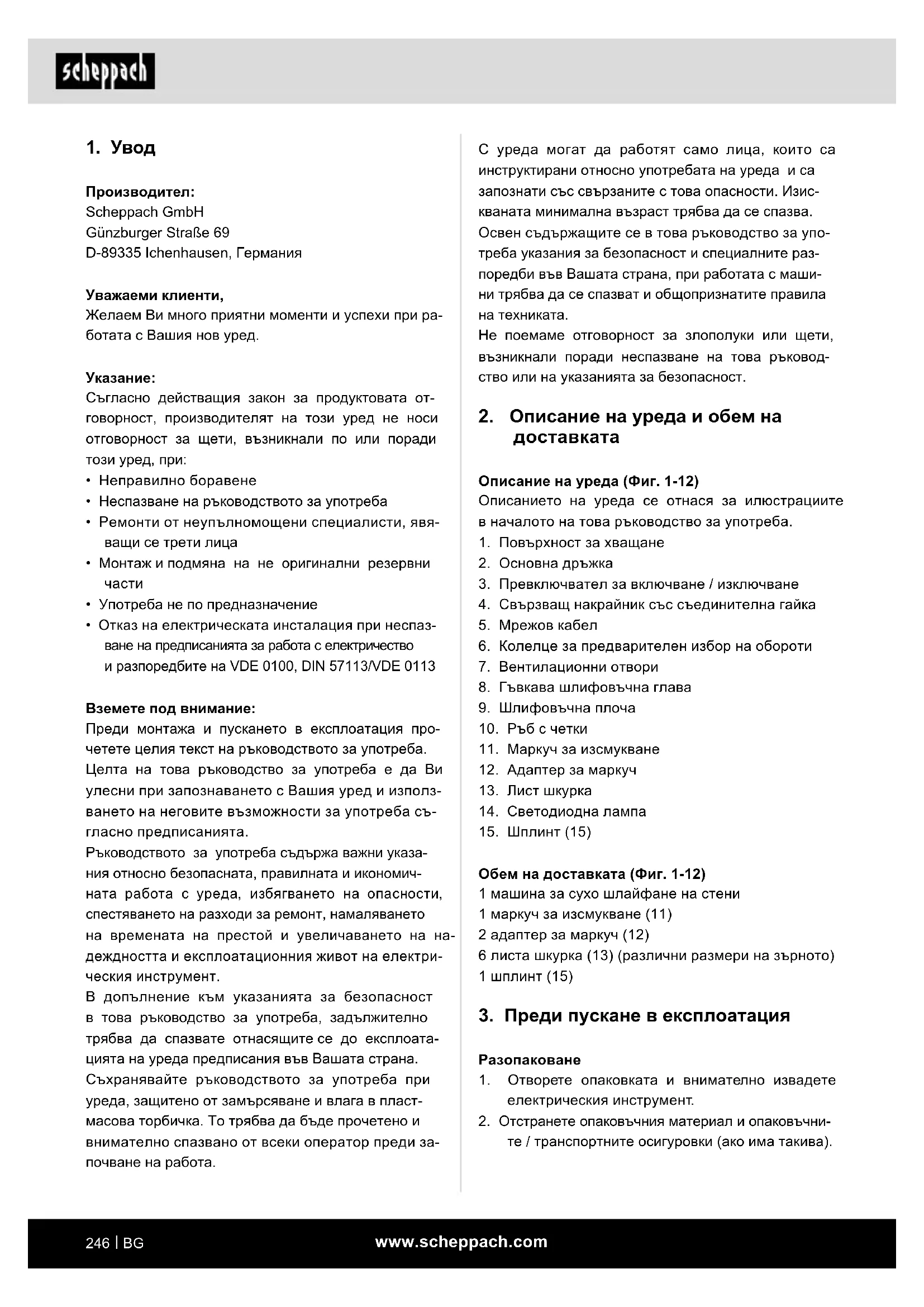 m ПРЕДУПРЕЖДЕНИЕ Прочетете всички указа- ния за безопасност и инструкциите, илюстраци- ите и техническите данни, предоставени с този електрически инструмент. Пропуски при спазването на инструкциите по-долу могат да доведат до токов удар, пожар и/или тежки наранявания. Запазете всички указания за безопасност и ин- струкции за бъдещи справки. Използваното в указанията за безопасност понятие „електрически инструмент“ се отнася до захранва- ни от мрежата електрически инструменти (с мрежов кабел) и до захранвани с акумулатор електрически инструменти (без мрежов кабел). Безопасност на работното място a) Поддържайте работното си място чисто и добре осветено. Безпорядъкът или неосветени- те работни места могат да доведат до злополуки. b) Не работете с електрическия инструмент във взривоопасна среда, в която има запалими течности, газове или прахове. Електрическите инструменти създават искри, които могат да въз- пламенят праха или парите. c) Дръжте деца и други лица далеч по време на използването на електрическия инструмент. При разсейване можете да изгубите контрол върху електрическия инструмент. Безопасност при работа с електрически ток a) Щепселът на електрическия инструмент трябва да отговаря на контакта. Щепселът не бива да се променя по никакъв начин. Не използвайте адаптерни щепсели заедно със заземени електрически инструменти. Непро- менен щепсел и подходящи контакти намаляват риска от токов удар. b) Избягвайте телесен контакт със заземени по- върхности като тръби, отоплителни уреди, фурни и хладилници. Съществува повишен риск от токов удар, когато тялото Ви е заземено. c) Пазете електрическите инструменти от дъжд и влага. Проникването на вода в електрическия инструмент увеличава риска от токов удар. d) Не използвайте свързващия проводник не по предназначение, за носене или за- качане на електрическия инструмент или за издърпване на щепсела от контакта.www.scheppach.com