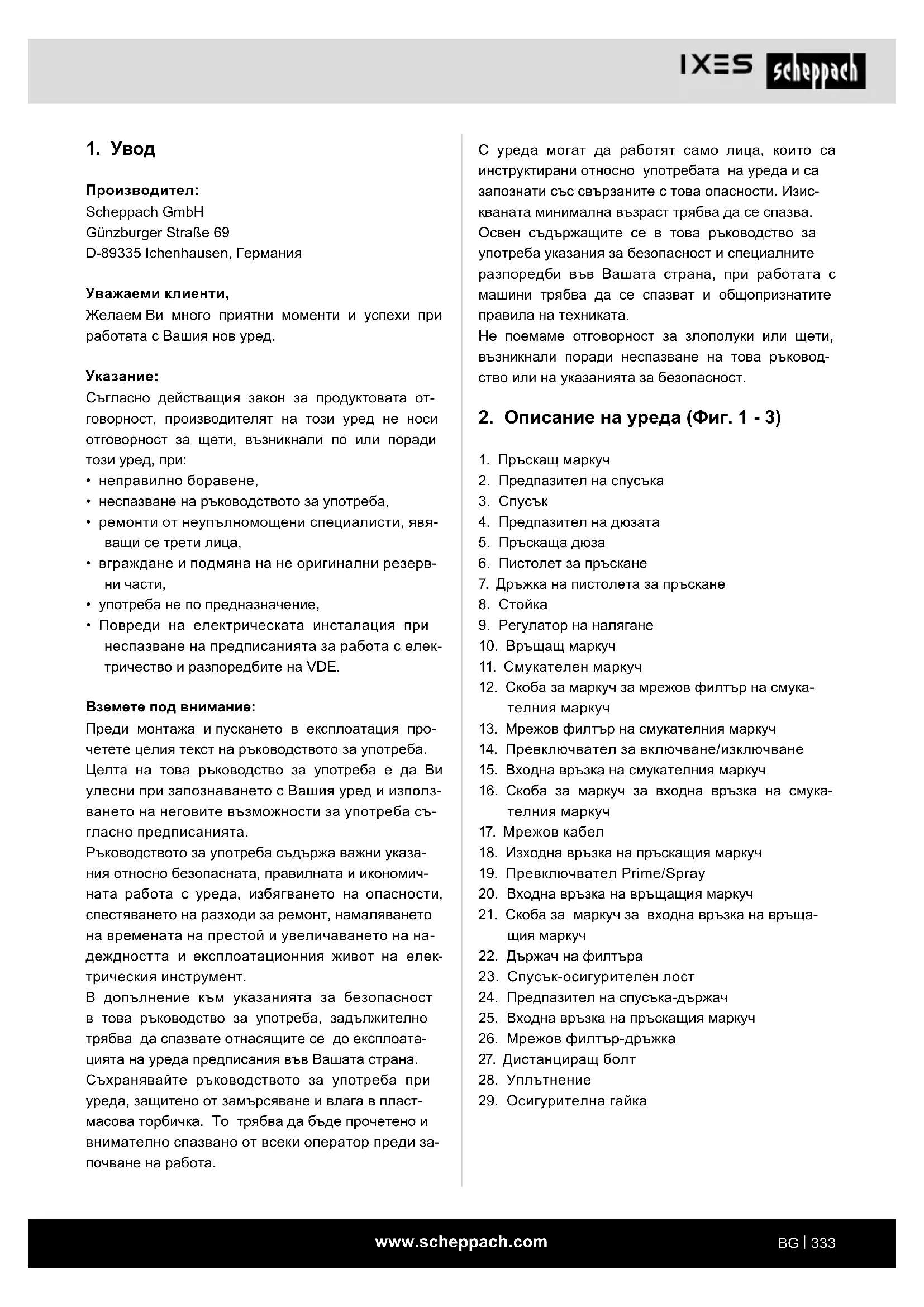 Системата за безвъздушно боядисване е подхо- дяща за средни и големи ремонтни дейности в до- ма и градината. Тя е разработена така, че боята да може да се изсмуква директно от кофата и да се нанася върху големи площи за кратко време. Това включва повърхности като огради, перголи, наве- си, дървени фасади, павилиони, гаражни врати, решетки и стени. Уредът не е предназначен само за домашна употреба. В Глава 8 ще намерите по- вече информация за това какви материали може- те да използвате с уреда. Прочетете настоящото ръководство за употреба и се запознайте с него, преди да използвате уреда . Това ръководство за употреба трябва да бъде предадено нататък, ако уредът се използва от тре- ти лица.www.scheppach.com