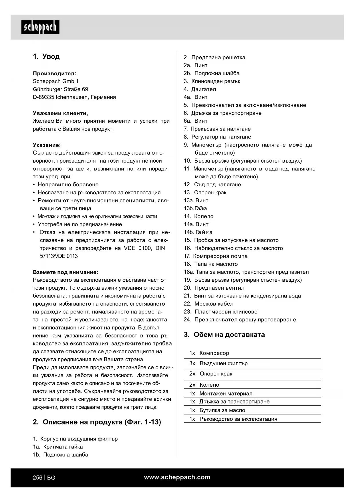1x Компресор 3x Въздушен филтър 2x Опорен крак 2x Колело 1x Монтажен материал 1x Дръжка за транспортиране 1x Бутилка за масло 1x Ръководство за експлоатацияwww.scheppach.com