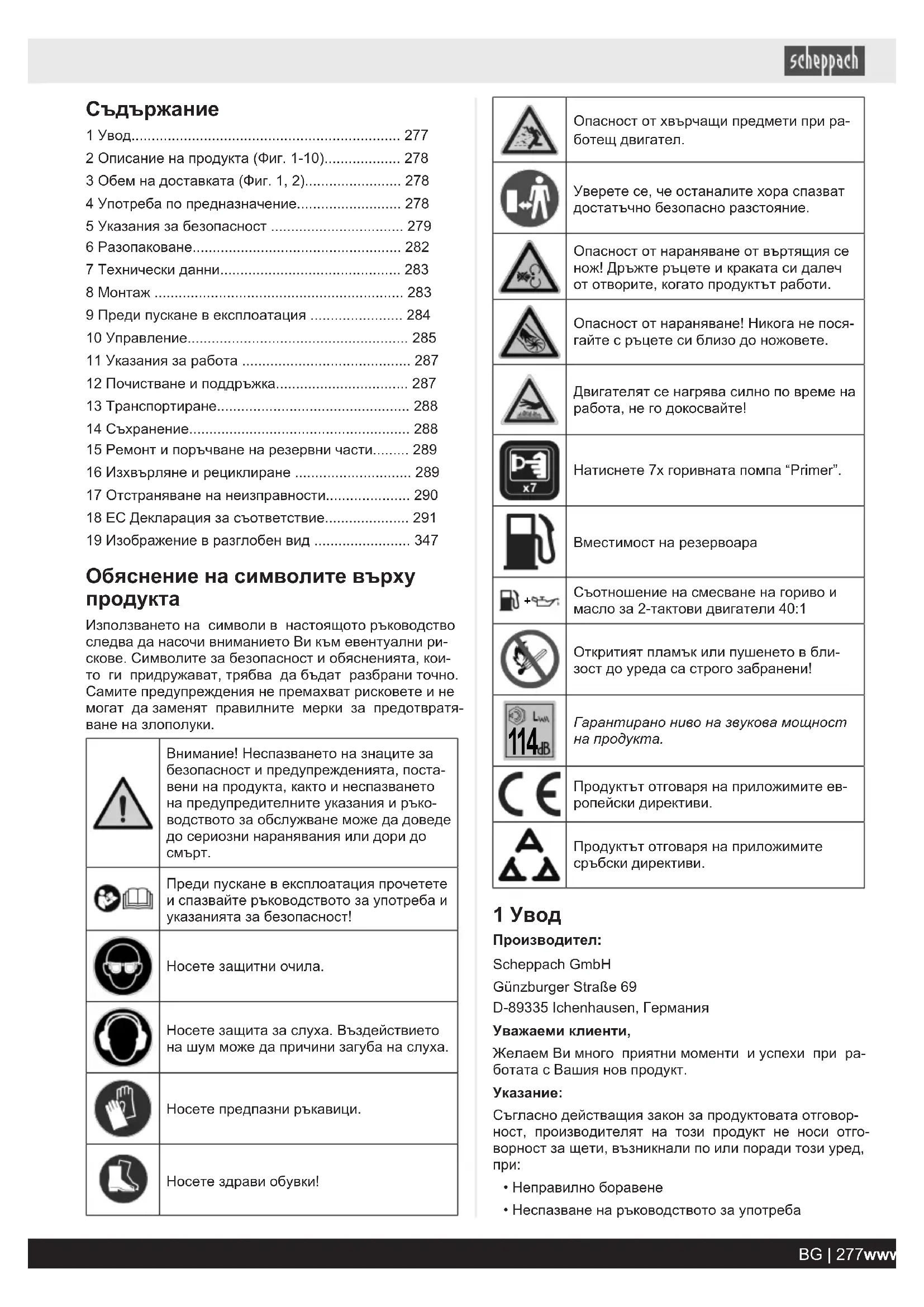 - Проверете капаците и защитните устройства за повреди и правилно положение. Сменете ги, ако е необходимо. BG | 279www.scheppach.com• Никога не използвайте продукта с дефектни щито- ве или без предпазни устройства. ПРЕДУПРЕЖДЕНИЕ Горивото е силно запалимо: