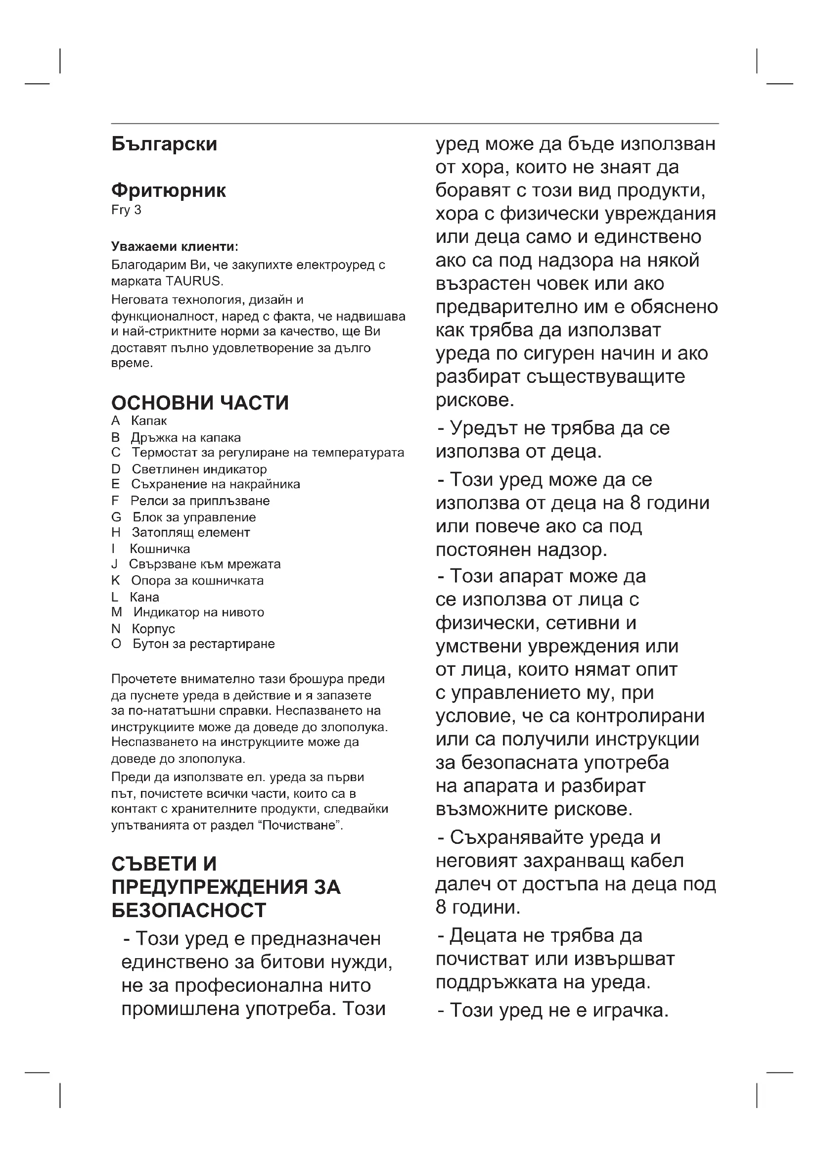 Fry 3 Уважаеми клиенти: БлагодаримВи,чезакупихтеелектроуредс маркатаTAURUS. Неговататехнология,дизайни функционалност,наредсфакта,ченадвишава инай-стриктнитенормизакачество,щеВи доставятпълноудовлетворениезадълго