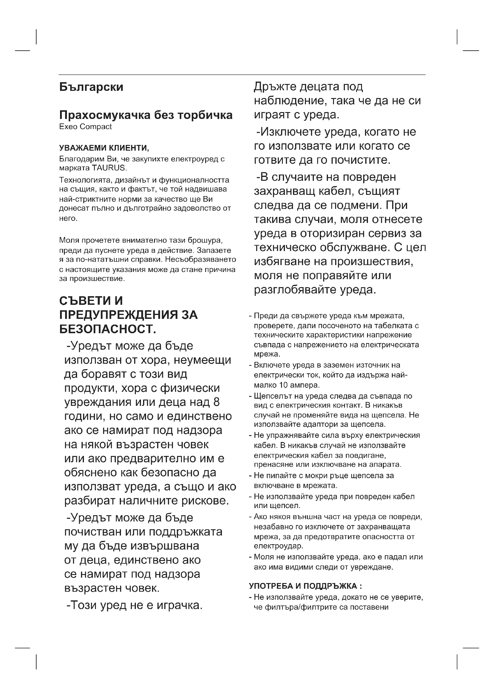 Exeo Compact - Прахосмукачка TAURUS - Безплатно ръководство за потребителя