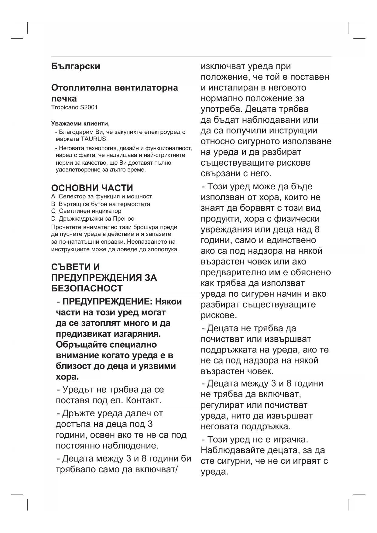 Tropicano S2001 Уважаеми клиенти, - Благодарим Ви, че закупихте електроуред с марката TAURUS. - Неговата технология, дизайн и функционалност, наред с факта, че надвишава и най-стриктните норми за качество, ще Ви доставят пълно удовлетворение за дълго време. ОСНОВНИ ЧАСТИ A Селектор за функция и мощност B Въртящ се бутон на термостата C Светлинен индикатор D Дръжка/дръжки за Пренос Прочетете внимателно тази брошура преди да пуснете уреда в действие и я запазете за по-нататъшни справки. Неспазването на инструкциите може да доведе до злополука.