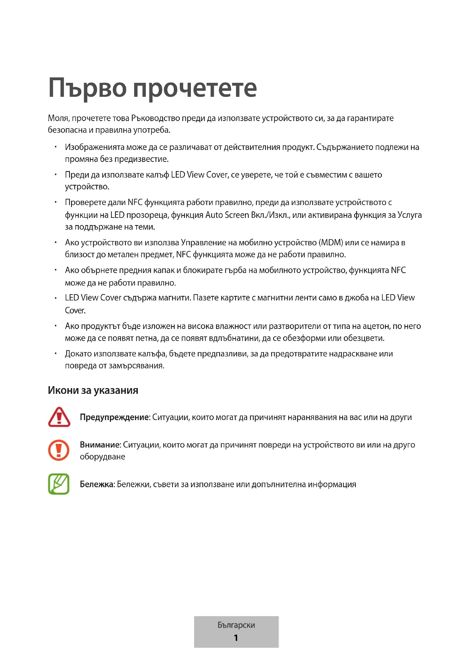 Докато използвате калъфа, бъдете предпазливи, за да предотвратите надраскване или повреда от замърсявания. Икони за указания Предупреждение: Ситуации, които могат да причинят наранявания на вас или на други Внимание: Ситуации, които могат да причинят повреди на устройството ви или на друго