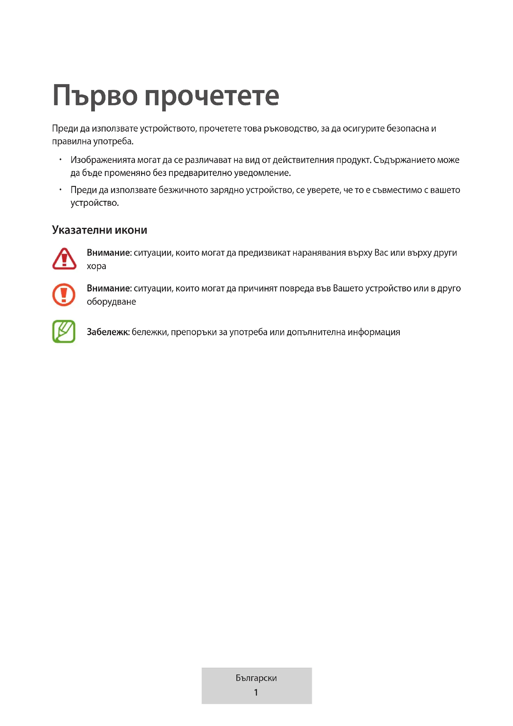 Преди да използвате безжичното зарядно устройство, се уверете, че то е съвместимо с вашето устройство. Указателни икони Внимание: ситуации, които могат да предизвикат наранявания върху Вас или върху други