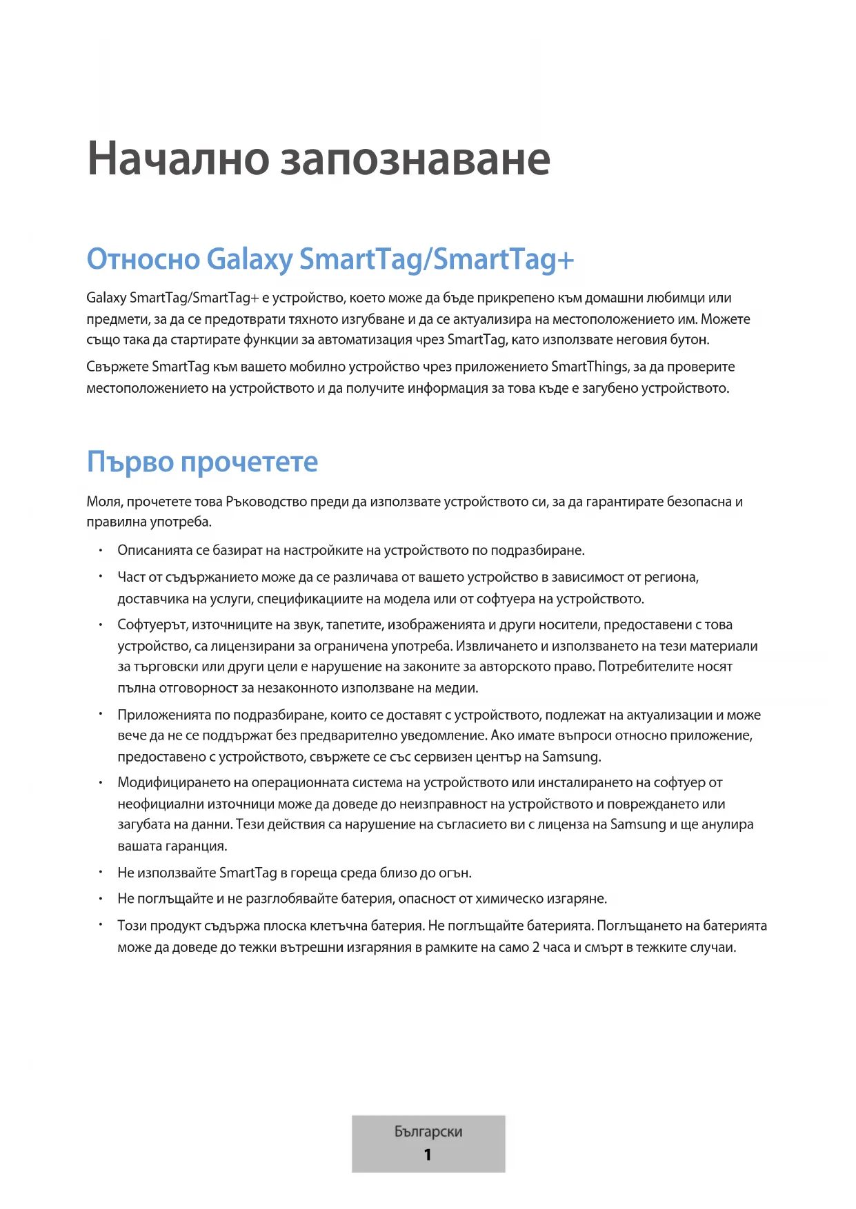 Начално запознаване Относно Galaxy SmartTag/SmartTag+ Galaxy SmartTag/SmartTag+ е устройство, което може да бъде прикрепено към домашни любимци или предмети, за да се предотврати тяхното изгубване и да се актуализира на местоположението им. Можете също така да стартирате функции за автоматизация чрез SmartTag, като използвате неговия бутон.Свържете SmartTag към вашето мобилно устройство чрез приложението SmartThings, за да проверите местоположението на устройството и да получите информация за това къде е загубено устройството. Първо прочетете Моля, прочетете това Ръководство преди да използвате устройството си, за да гарантирате безопасна и правилна употреба. Описанията се базират на настройките на устройството по подразбиране. Част от съдържанието може да се различава от вашето устройство в зависимост от региона, доставчика на услуги, спецификациите на модела или от софтуера на устройството. Софтуерът, източниците на звук, тапетите, изображенията и други носители, предоставени с това устройство, са лицензирани за ограничена употреба. Извличането и използването на тези материали за търговски или други цели е нарушение на законите за авторското право. Потребителите носят пълна отговорност за незаконното използване на медии. Приложенията по подразбиране, които се доставят с устройството, подлежат на актуализации и може вече да не се поддържат без предварително уведомление. Ако имате въпроси относно приложение, предоставено с устройството, свържете се със сервизен център на Samsung. Модифицирането на операционната система на устройството или инсталирането на софтуер от неофициални източници може да доведе до неизправност на устройството и повреждането или загубата на данни. Тези действия са нарушение на съгласието ви с лиценза на Samsung и ще анулира вашата гаранция. Не използвайте SmartTag в гореща среда близо до огън. Не поглъщайте и не разглобявайте батерия, опасност от химическо изгаряне. Този продукт съдържа плоска клетъчна батерия. Не поглъщайте батерията. Поглъщането на батерията може да доведе до тежки вътрешни изгаряния в рамките на само 2 часа и смърт в тежките случаи.