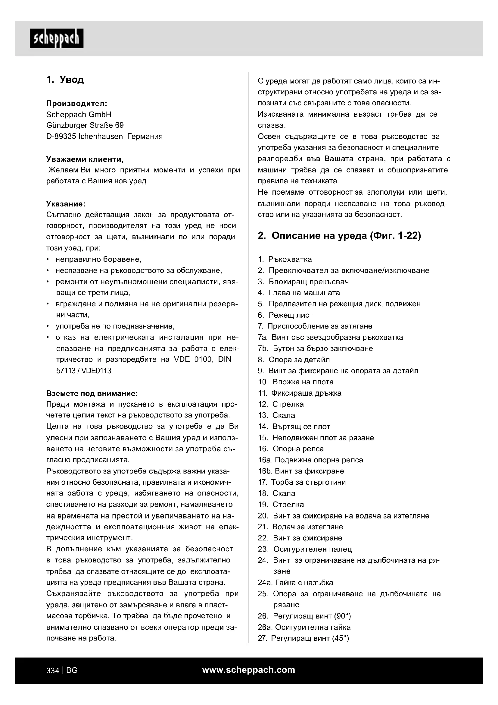 - отказ на електрическата инсталация при не- спазване на предписанията за работа с елек- тричество и разпоредбите на VDE 0100, DIN 57113 / VDE0113. Вземете под внимание: Преди монтажа и пускането в експлоатация про- четете целия текст на ръководството за употреба. Целта на това ръководство за употреба е да Ви улесни при запознаването с Вашия уред и използ- ването на неговите възможности за употреба съ- гласно предписанията. Ръководството за употреба съдържа важни указа- ния относно безопасната, правилната и икономич- ната работа с уреда, избягването на опасности, спестяването на разходи за ремонт, намаляването на времената на престой и увеличаването на на- деждността и експлоатационния живот на елек- трическия инструмент. В допълнение към указанията за безопасност в това ръководство за употреба, задължително трябва да спазвате отнасящите се до експлоата- цията на уреда предписания във Вашата страна. Съхранявайте ръководството за употреба при уреда, защитено от замърсяване и влага в пласт- масова торбичка. То трябва да бъде прочетено и внимателно спазвано от всеки оператор преди за- почване на работа.www.scheppach.com