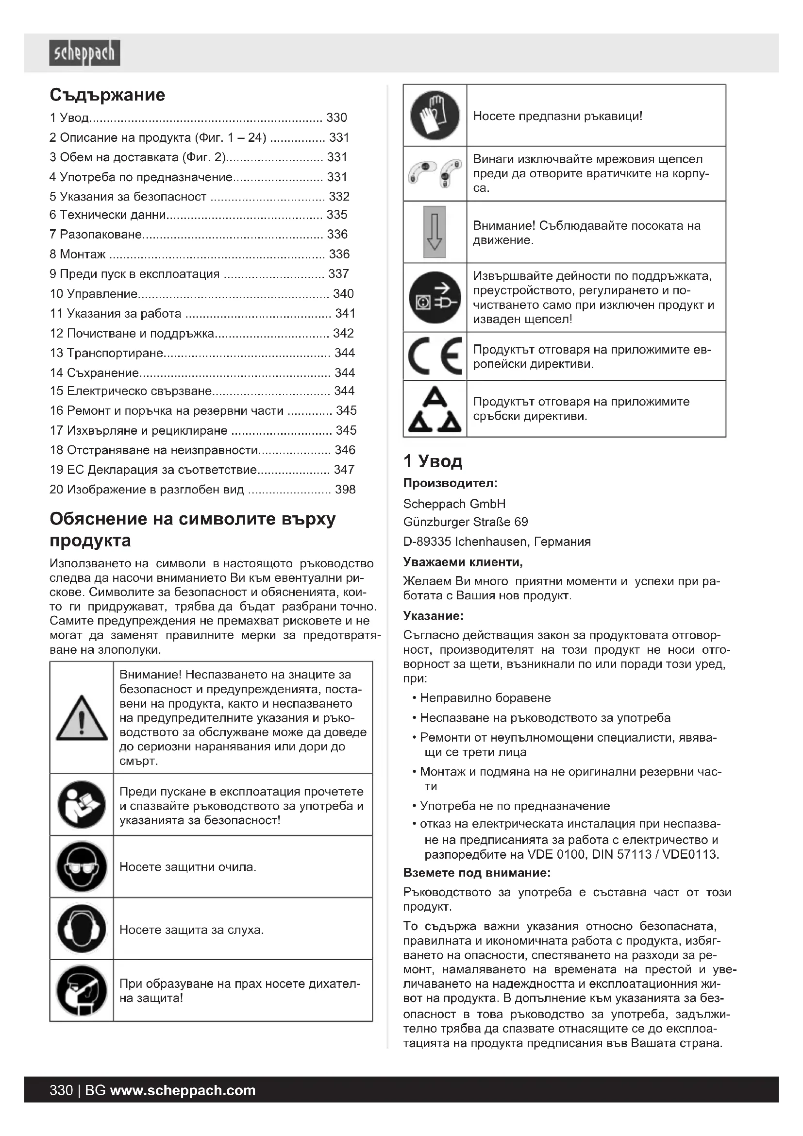 То съдържа важни указания относно безопасната, правилната и икономичната работа с продукта, избяг- ването на опасности, спестяването на разходи за ре- монт, намаляването на времената на престой и уве- личаването на надеждността и експлоатационния жи- вот на продукта. В допълнение към указанията за без- опасност в това ръководство за употреба, задължи- телно трябва да спазвате отнасящите се до експлоа- тацията на продукта предписания във Вашата страна. 330 | BG www.scheppach.comПреди да използвате продукта, запознайте се с всички указания за работа и безопасност. Използвайте про- дукта само както е описано и за посочените области на употреба. Съхранявайте ръководството за употре- ба на сигурно място и предавайте всички документи, когато предавате продукта на трети лица. 2 Описание на продукта (Фиг. 1 – 24)