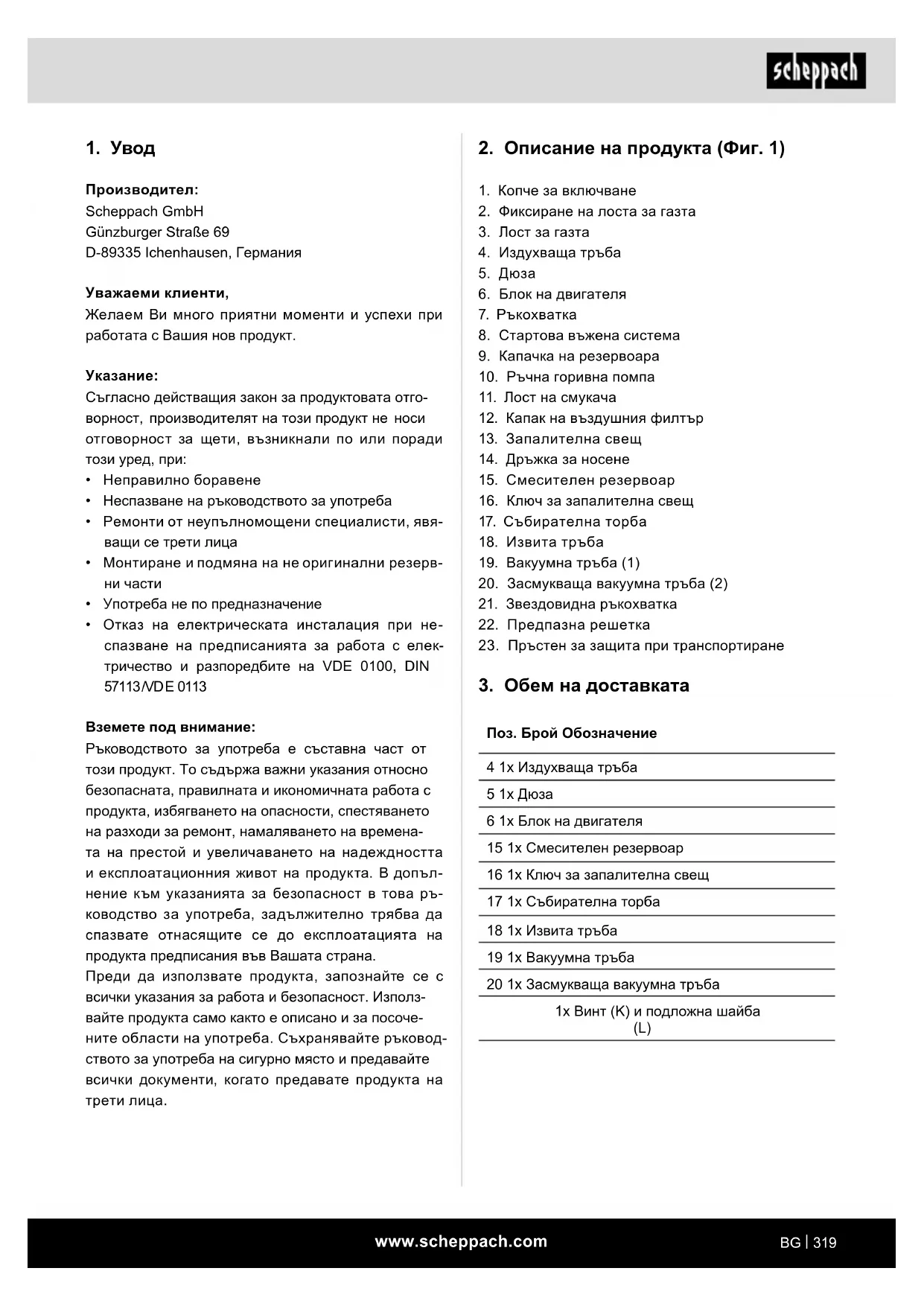 - Отказ на електрическата инсталация при не- спазване на предписанията за работа с елек- тричество и разпоредбите на VDE 0100, DIN 57113/VDE 0113 Вземете под внимание: Ръководството за употреба е съставна част от този продукт. То съдържа важни указания относно безопасната, правилната и икономичната работа с продукта, избягването на опасности, спестяването на разходи за ремонт, намаляването на времена- та на престой и увеличаването на надеждността и експлоатационния живот на продукта. В допъл- нение към указанията за безопасност в това ръ- ководство за употреба, задължително трябва да спазвате отнасящите се до експлоатацията на продукта предписания във Вашата страна. Преди да използвате продукта, запознайте се с всички указания за работа и безопасност. Използ- вайте продукта само както е описано и за посоче- ните области на употреба. Съхранявайте ръковод- ството за употреба на сигурно място и предавайте всички документи, когато предавате продукта на трети лица.www.scheppach.com
