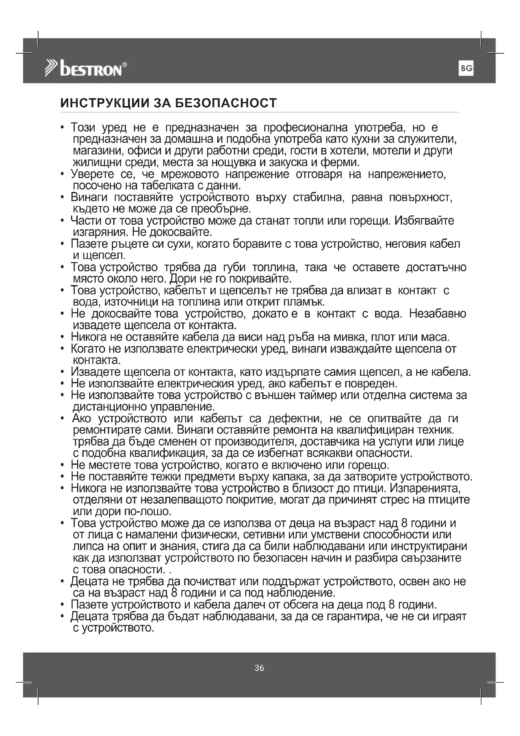 В малко вероятния случай на повреда, свържете се с отдела за обслужване на клиенти на Bestron: www.bestron.com/service Технически спецификации Модел ADWM730CO Мрежа 220-240V Честота (Hz) 50/60 Клас по безопасност I Мощност (Watt) 1200 шум (dB(A)) - Капацитет - Максимално време за непрекъсната работа (KB) - Размери (В x Ш x Г) (cm) 17,5x38,0x33,0 Дължина на кабела (cm) 70