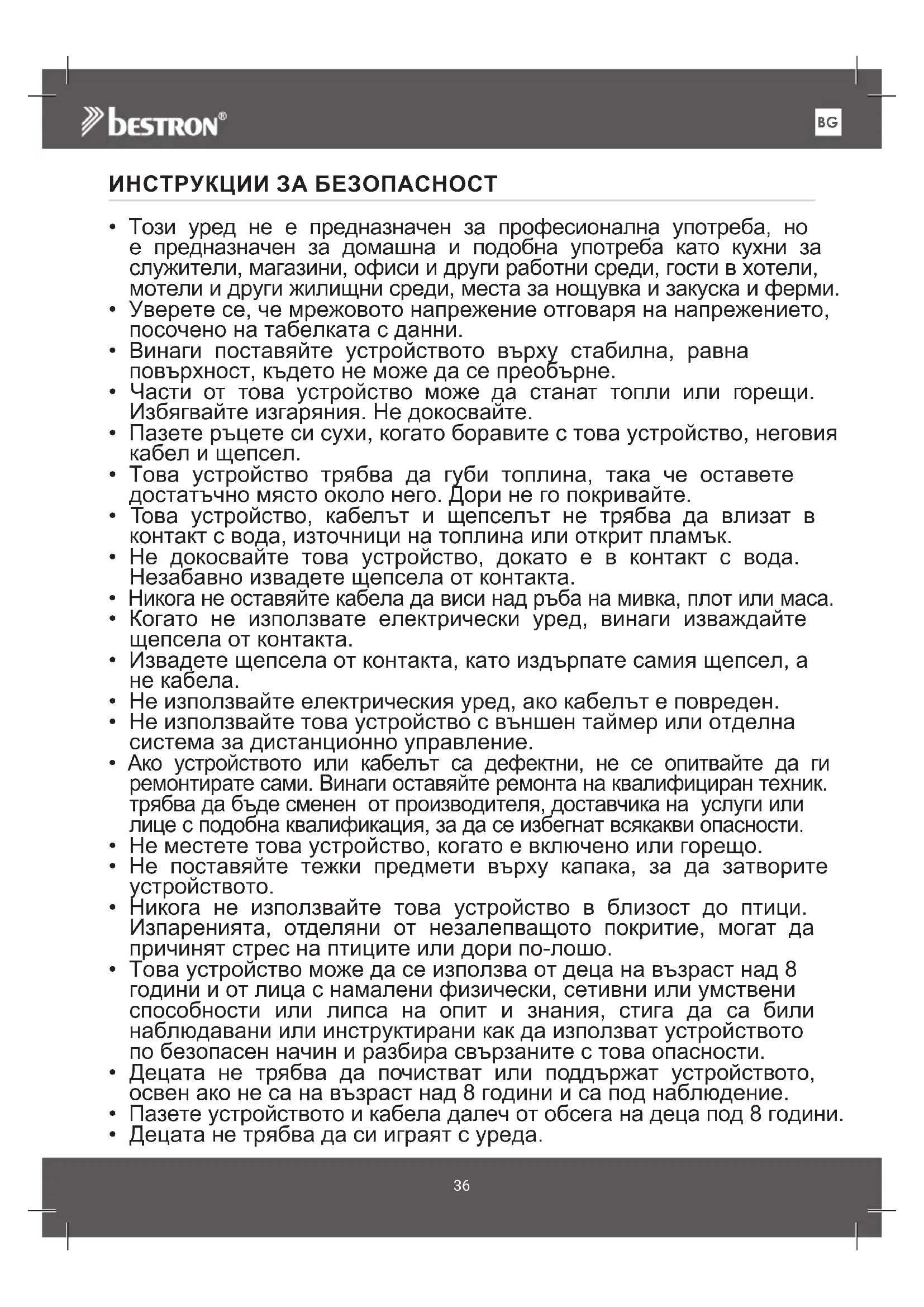 В малко вероятния случай на повреда, свържете се с отдела за обслужване на клиенти на Bestron: www.bestron.com/service Технически спецификации Модел ABWM300 Мрежа 220-240V~ Честота (Hz) 50/60 Клас по безопасност 1 Мощност (Watt) 700 шум (dB(A)) - Капацитет - Максимално време за непрекъсната работа (KB) - Размери (В x Ш x Г) (cm) 26,0x21,0x8,8 Дължина на кабела (cm) 68BG