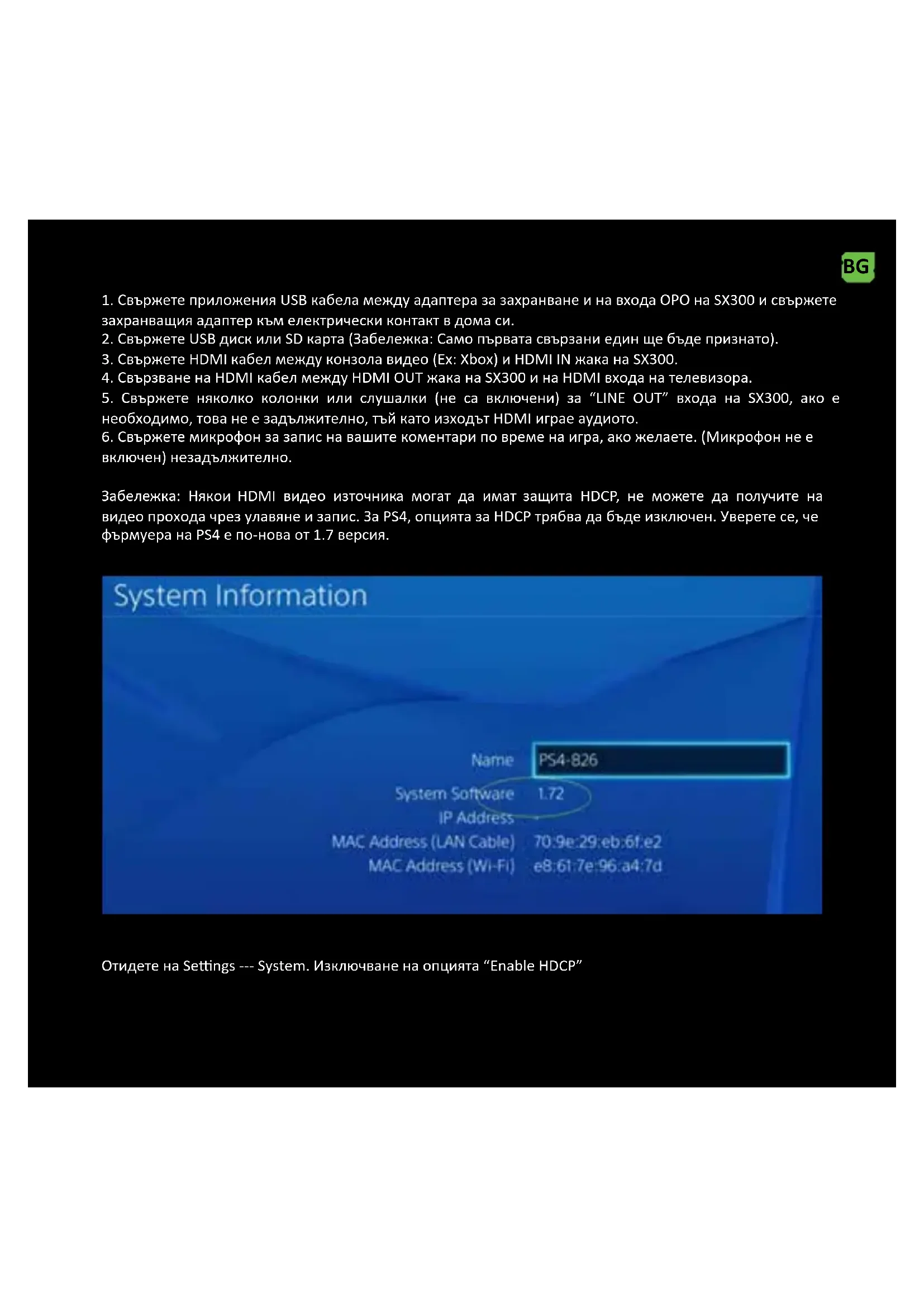 включен) незадължително. Забележка: Някои HDMI видео източника могат да имат защита HDCP, не можете да получите на видео прохода чрез улавяне и запис. За PS4, опцията за HDCP трябва да бъде изключен. Уверете се, че фърмуера на PS4 е по-нова от 1.7 версия. Отидете на Sengs --- System. Изключване на опцията “Enable HDCP” BGBG Забележка: Изключване на опцията за HDCP само за запис на игри, а не за изгаряне на Bluray съдържание филм.YPbPr компонентен видео връзка (DVD плейър, PS3 и т.н.)