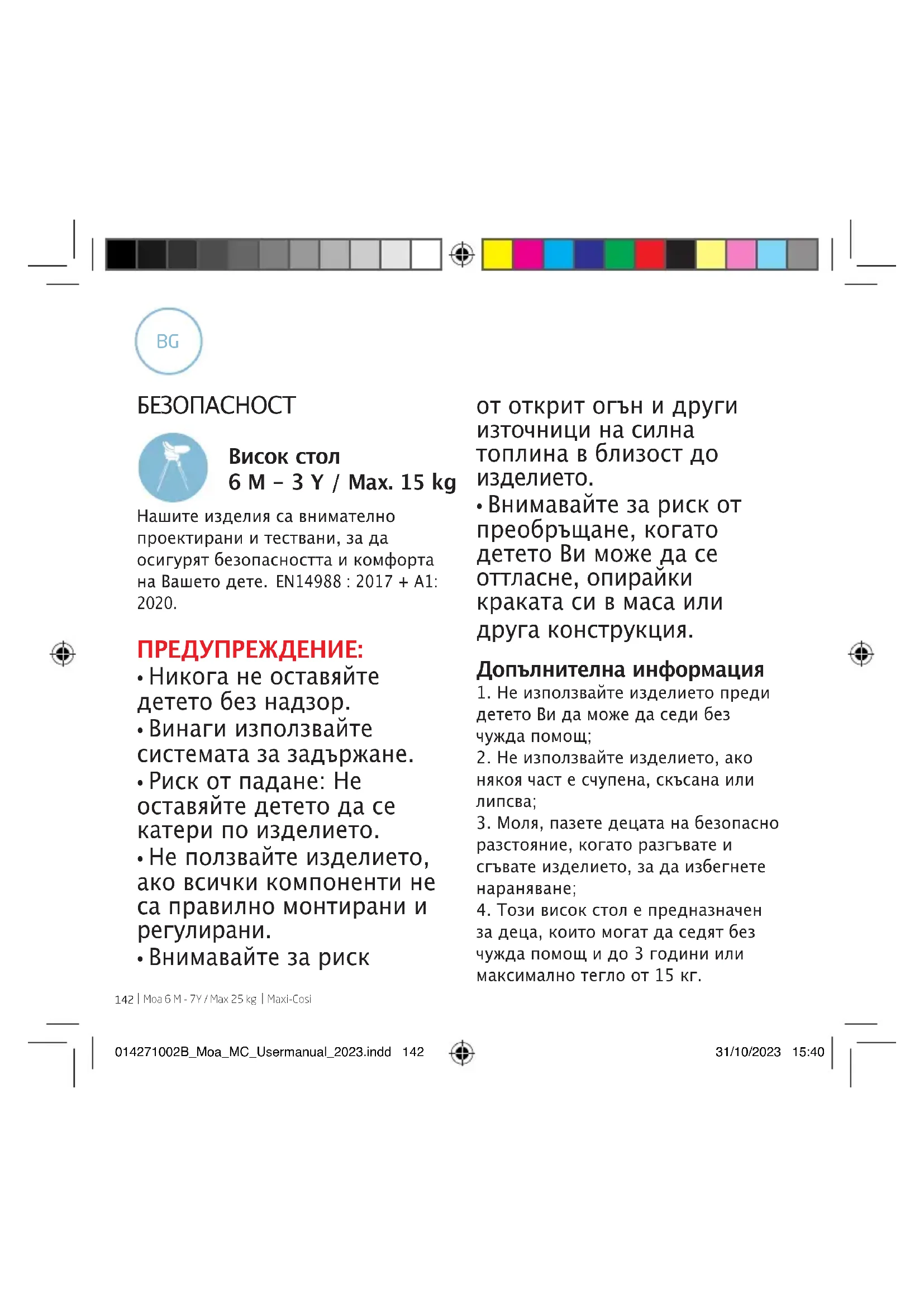 6 M - 3 Y / Max. 15 kg Нашите изделия са внимателно проектирани и тествани, за да осигурят безопасността и комфорта на Вашето дете. EN 16120: 2012 + A2:2016. ПРЕДУПРЕЖДЕНИЕ: