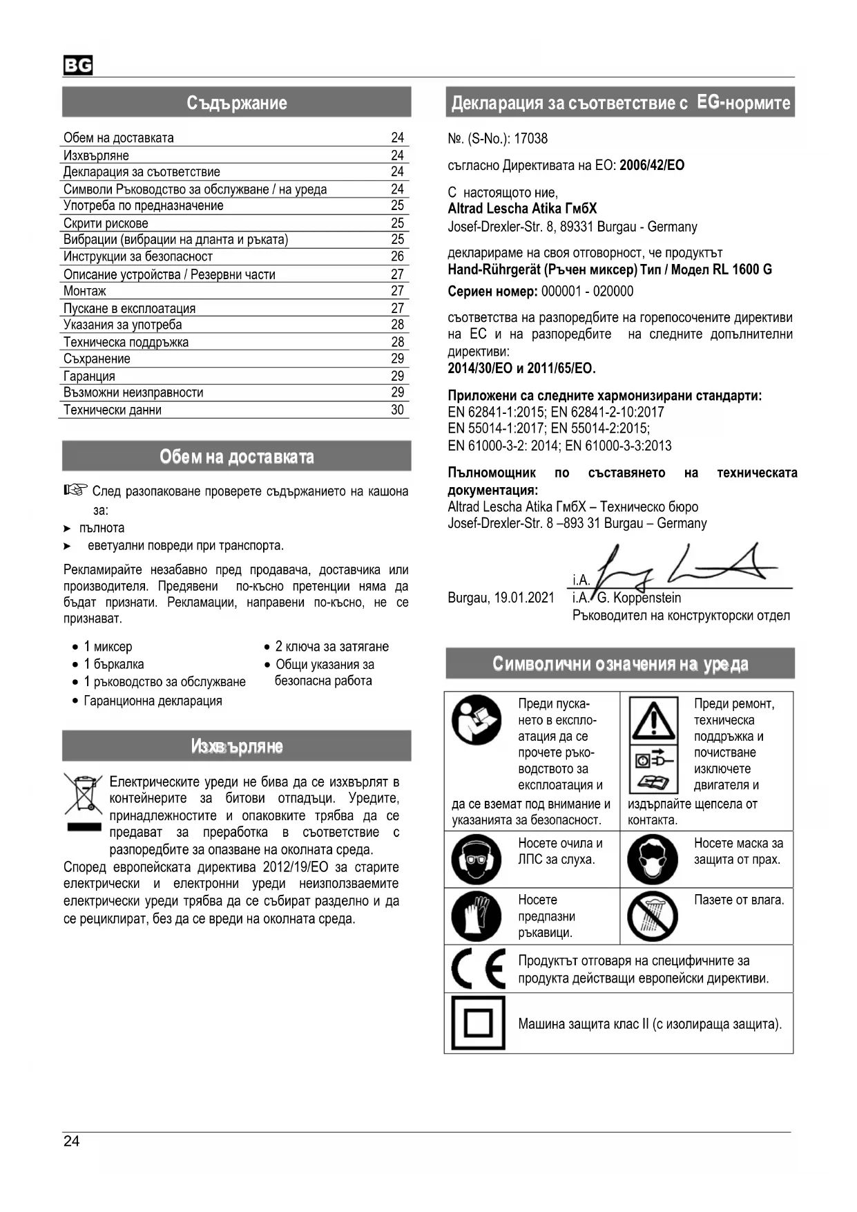 №. (S-No.): 17038 съгласно Директивата на ЕО: 2006/42/EO С настоящото ние, Altrad Lescha Atika ГмбХ Josef-Drexler-Str. 8, 89331 Burgau - Germany декларираме на своя отговорност, че продуктът Hand-Rührgerät (Ръчен миксер) Тип / Модел RL 1600 G Сериен номер: 000001 - 020000 съответства на разпоредбите на горепосочените директиви на ЕС и на разпоредбите на следните допълнителни