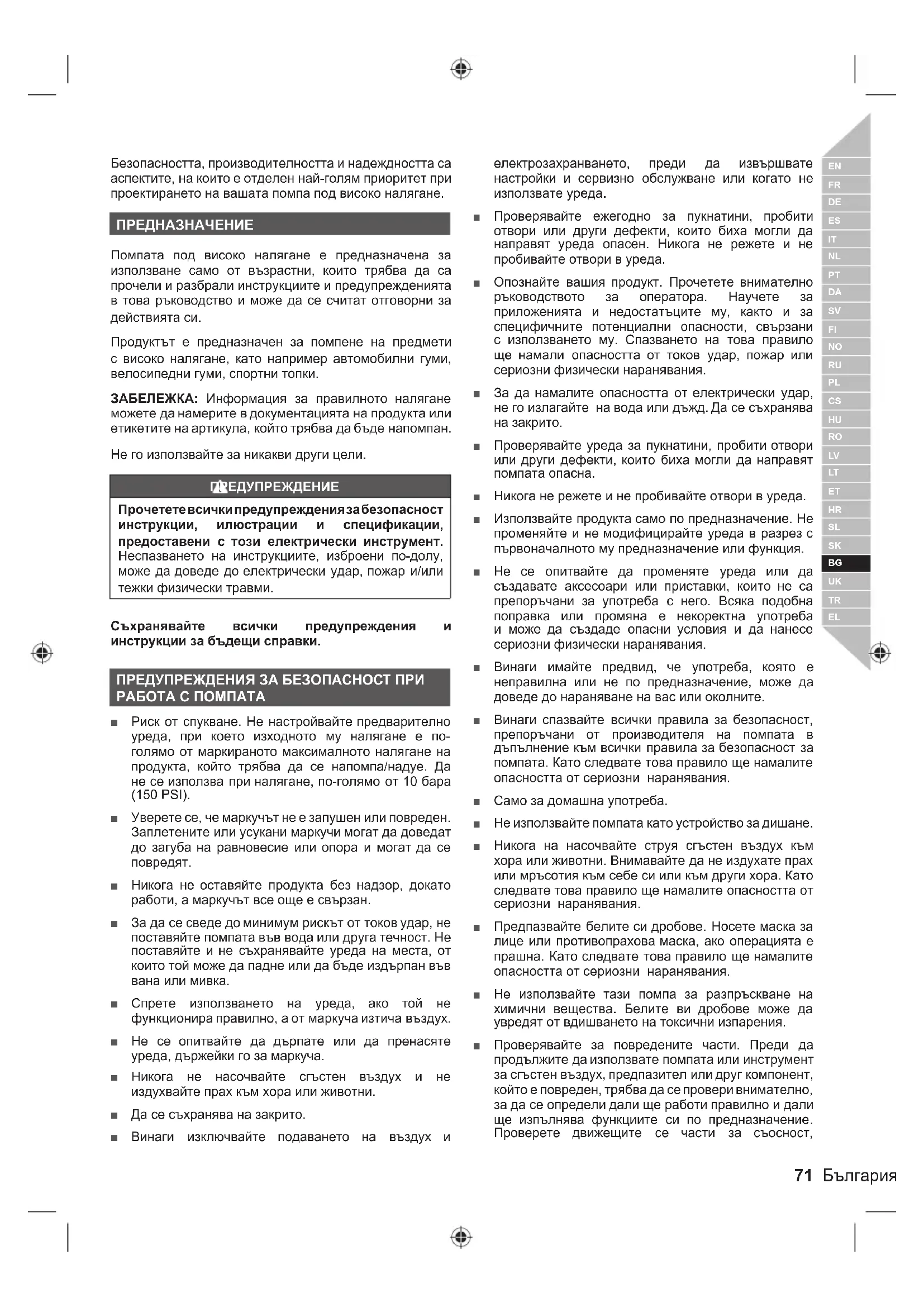 Безопасността, производителността и надеждността са аспектите, на които е отделен най-голям приоритет при проектирането на вашата помпа под високо налягане. ПРЕДНАЗНАЧЕНИЕ Помпата под високо налягане е предназначена за използване само от възрастни, които трябва да са прочели и разбрали инструкциите и предупрежденията в това ръководство и може да се считат отговорни за действията си. Продуктът е предназначен за помпене на предмети с високо налягане, като например автомобилни гуми, велосипедни гуми, спортни топки