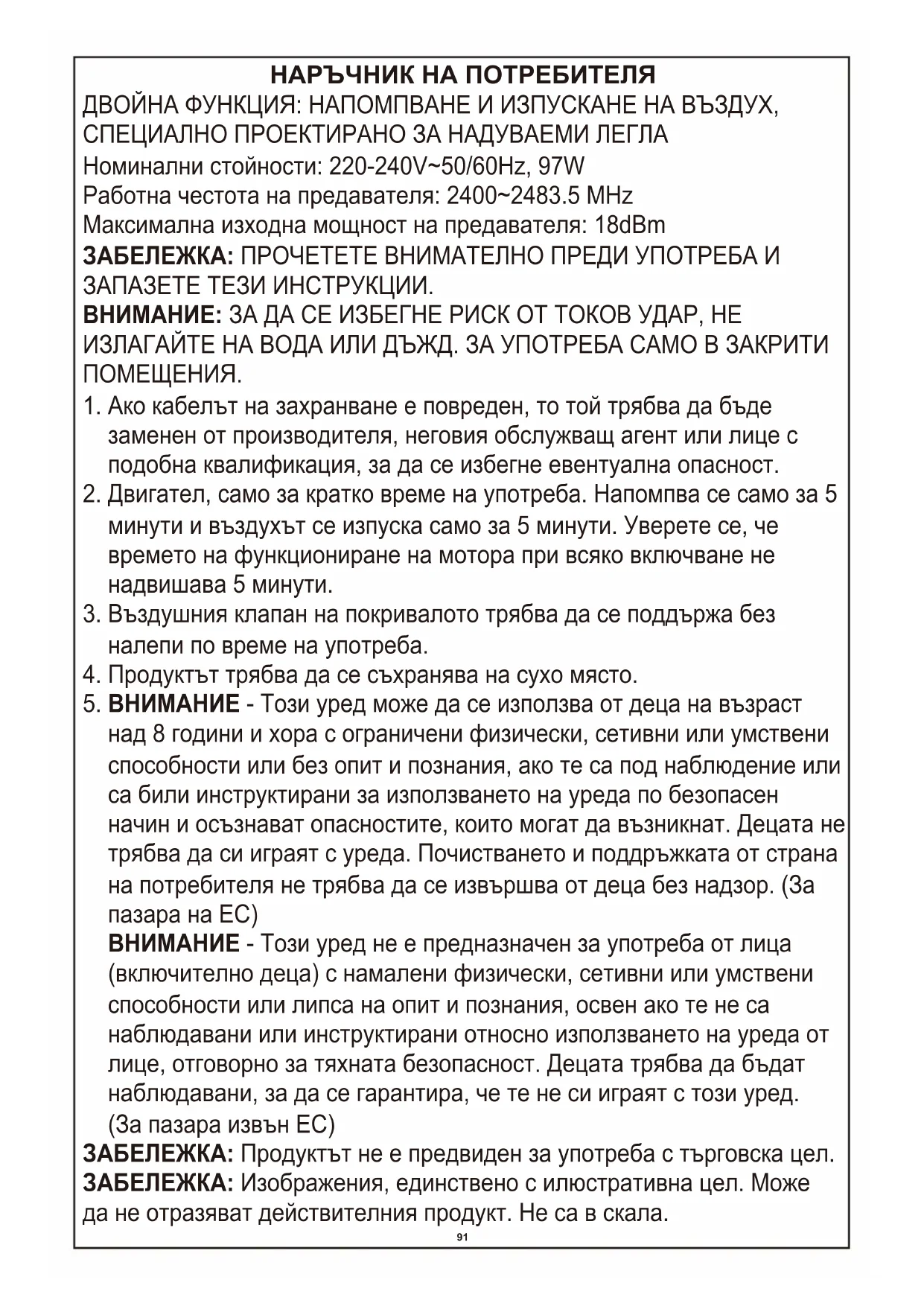 над 8 години и хора с ограничени физически, сетивни или умствени способности или без опит и познания, ако те са под наблюдение или са били инструктирани за използването на уреда по безопасен начин и осъзнават опасностите, които могат да възникнат. Децата не трябва да си играят с уреда. Почистването и поддръжката от страна на потребителя не трябва да се извършва от деца без надзор. (За пазара на ЕС) ВНИМАНИЕ - Този уред не е предназначен за употреба от лица (включително деца) с намалени физически, сетивни или умствени способности или липса на опит и познания, освен ако те не са наблюдавани или инструктирани относно използването на уреда от лице, отговорно за тяхната безопасност. Децата трябва да бъдат наблюдавани, за да се гарантира, че те не си играят с този уред. (За пазара извън ЕС) ЗАБЕЛЕЖКА: Продуктът не е предвиден за употреба с търговска цел. ЗАБЕЛЕЖКА: Изображения, единствено с илюстративна цел. Може да не отразяват действителния продукт. Не са в скала.92 Инструкции за експлоатация на помпата: ПОЧИСТВАНЕ & СЪХРАНЕНИЕ: