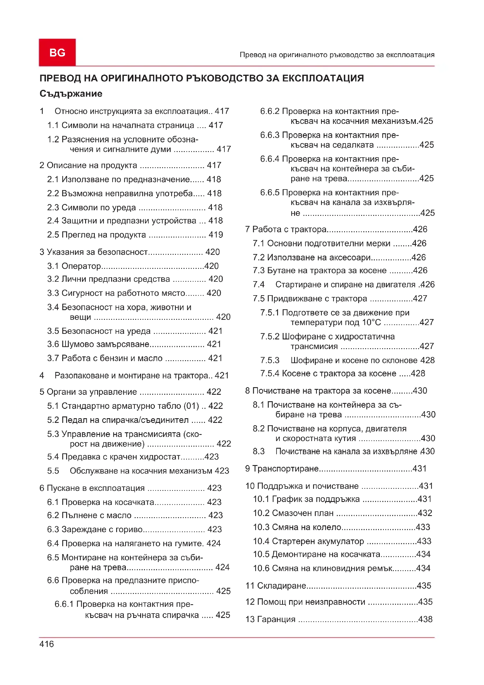 8 Почистване на трактора за косене.........430