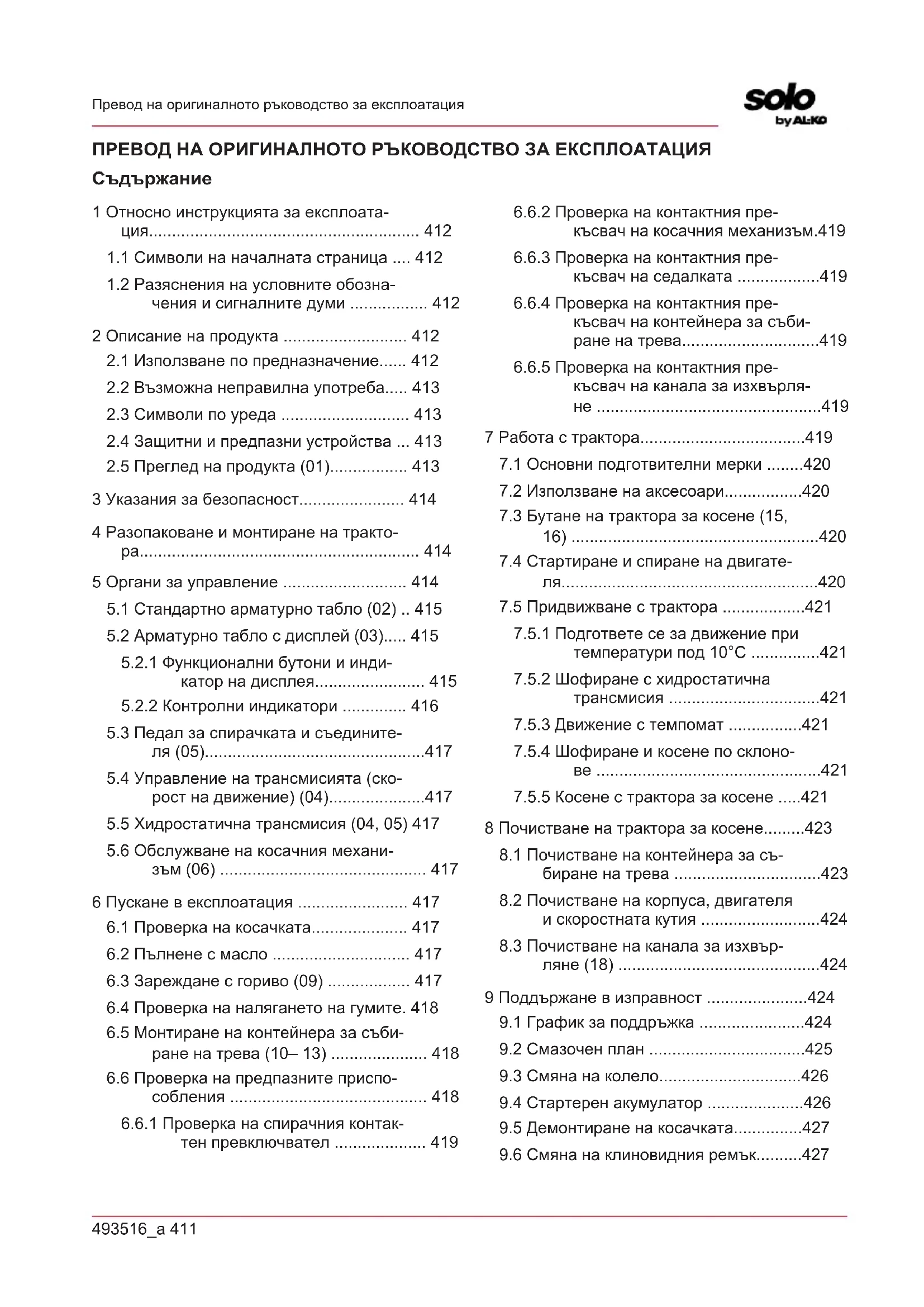 № Компонент 1 Волан 2 Арматурно табло 3 Спирачен педал 4 Капак на двигателя 5 Реверсивна скоростна кутия 6 Управление на трансмисията на- предBG 414 493516_a Указания за безопасност № Компонент 7 Косачен механизъм 8 Регулировка на височината на ря-