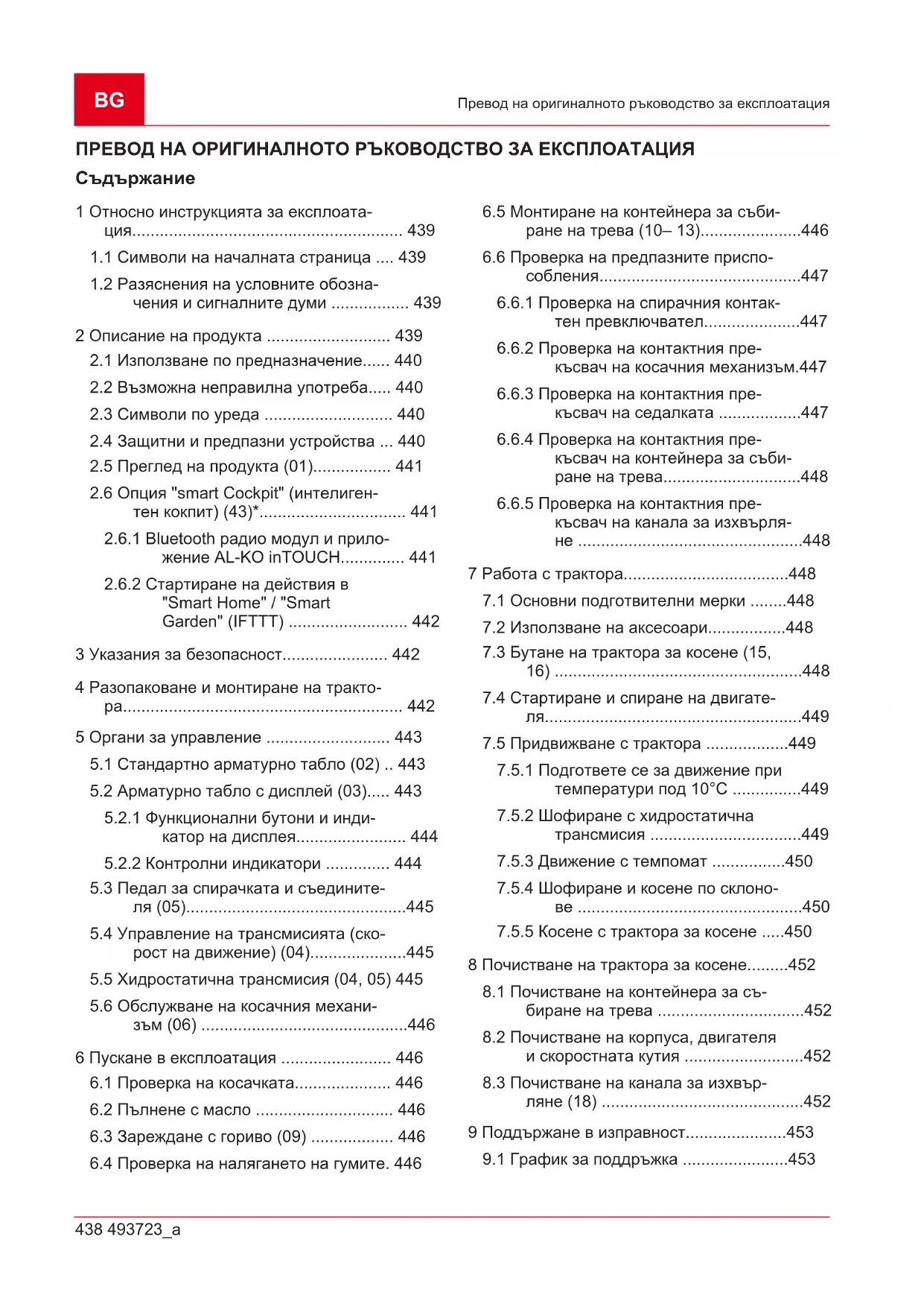 Двигатели с вътрешно горене (за тях важат гаранционните разпоредби на съответния про- изводител на мотора) Гаранционният период започва да тече след покупката от страна на първия краен потребител. Определяща е датата на документа за покупка. Моля, обърнете се с тази декларация и ориги- налния документ за покупка към вашия търговски представител или най-близкия център за об- служване на клиенти. Законовите претенции за дефекти от страна на купувача към продавача остават непроменени от тази декларация.493723_a 463 Перевод оригинального руководства по эксплуатации ПЕРЕВОД ОРИГИНАЛЬНОГО РУКОВОДСТВА ПО ЭКСПЛУАТАЦИИ