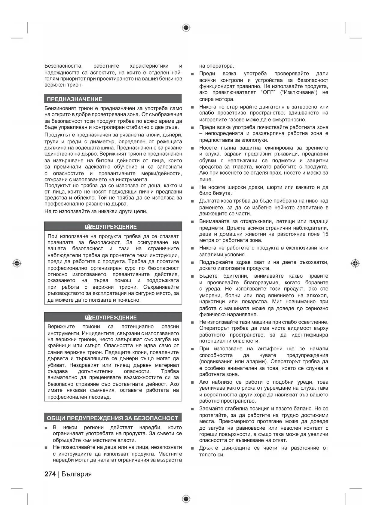 които не носят подходящи лични предпазни средства и облекло. Той не трябва да се използва за професионално рязане на дърва. Не го използвайте за никакви други цели. ПРЕДУПРЕЖДЕНИЕ При използване на продукта трябва да се спазват правилата за безопасност. За осигуряване на вашата безопасност и тази на страничните наблюдатели трябва да прочетете тези инструкции, преди да работите с продукта. Трябва да посетите професионално организиран курс по безопасност относно използването, превантивните действия, оказването на първа помощ и поддръжката при работа с верижни триони. Съхранявайте ръководството за експлоатация на сигурно място, за да можете да го ползвате и по-късно. ПРЕДУПРЕЖДЕНИЕ Верижните триони са потенциално опасни инструменти. Инцидентите, свързани с използването на верижни триони, често завършват със загуба на крайници или смърт. Опасността не идва само от самия верижен трион. Падащите клони, повалените дървета и търкалящите се дънери също могат да убиват. Нездравият или гниещ дървен материал създава допълнителни опасности. Трябва внимателно да преценявате възможностите си за безопасно справяне със съответната дейност. Ако имате някакви съмнения, оставете работата на професионален лесовъд. ОБЩИ ПРЕДУПРЕЖДЕНИЯ ЗА БЕЗОПАСНОСТ ■ В някои региони действат наредби, които ограничават употребата на продукта. За съвети се обръщайте към местните власти. ■ Не позволявайте на деца или на лица, незапознати с инструкциите да използват продукта. Местните наредби могат да налагат ограничения за възрастта на оператора. ■ Преди всяка употреба проверявайте дали всички контроли и устройства за безопасност функционират правилно. Не използвайте продукта, ако превключвателят “ОFF” (“Изключване“) не спира мотора. ■ Никога не стартирайте двигателя в затворено или слабо проветриво пространство; вдишването на изгорелите газове може да е смъртоносно. ■ Преди всяка употреба почиствайте работната зона – неподредената и разхвърляна работна зона е предпоставка за злополуки. ■ Носете пълна защитна екипировка за зрението и слуха, здрави предпазни ръкавици, предпазни обувки с неплъзгащи се подметки и защитни средства за главата, когато работите с продукта. Ако при косенето се отделя прах, носете и маска за