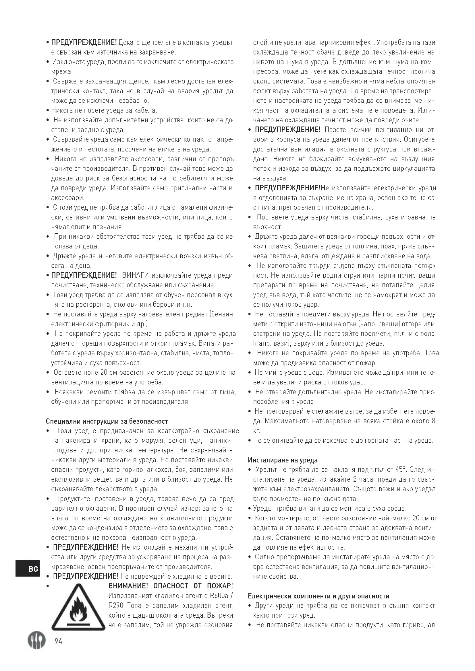 ВНИМАНИЕ! ОПАСНОСТ ОТ ПОЖАР! Използваният хладилен агент е R600a / R290 Това е запалим хладилен агент, който е щадящ околната среда. Въпреки че е запалим, той не уврежда озоновия слой и не увеличава парниковия ефект. Употребата на тази охлаждаща течност обаче доведе до леко увеличение на нивото на шума в уреда. В допълнение към шума на ком