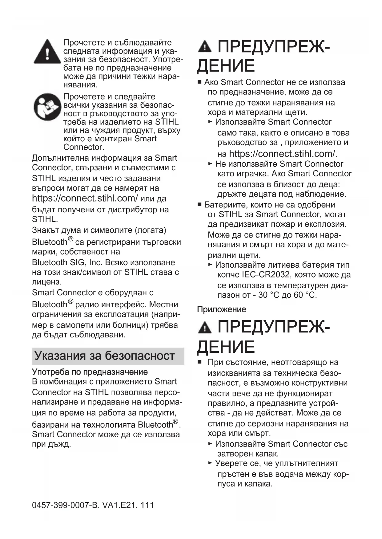 Прочетете и следвайте всички указания за безопас‐ ност в ръководството за упо‐ треба на изделието на STIHL или на чуждия продукт, върху който е монтиран Smart Connector. Допълнителна информация за Smart Connector, свързани и съвместими с STIHL изделия и често задавани въпроси могат да се намерят на https://connect.stihl.com/ или да бъдат получени от дистрибутор на STIHL. Знакът дума и символите (логата) Bluetooth