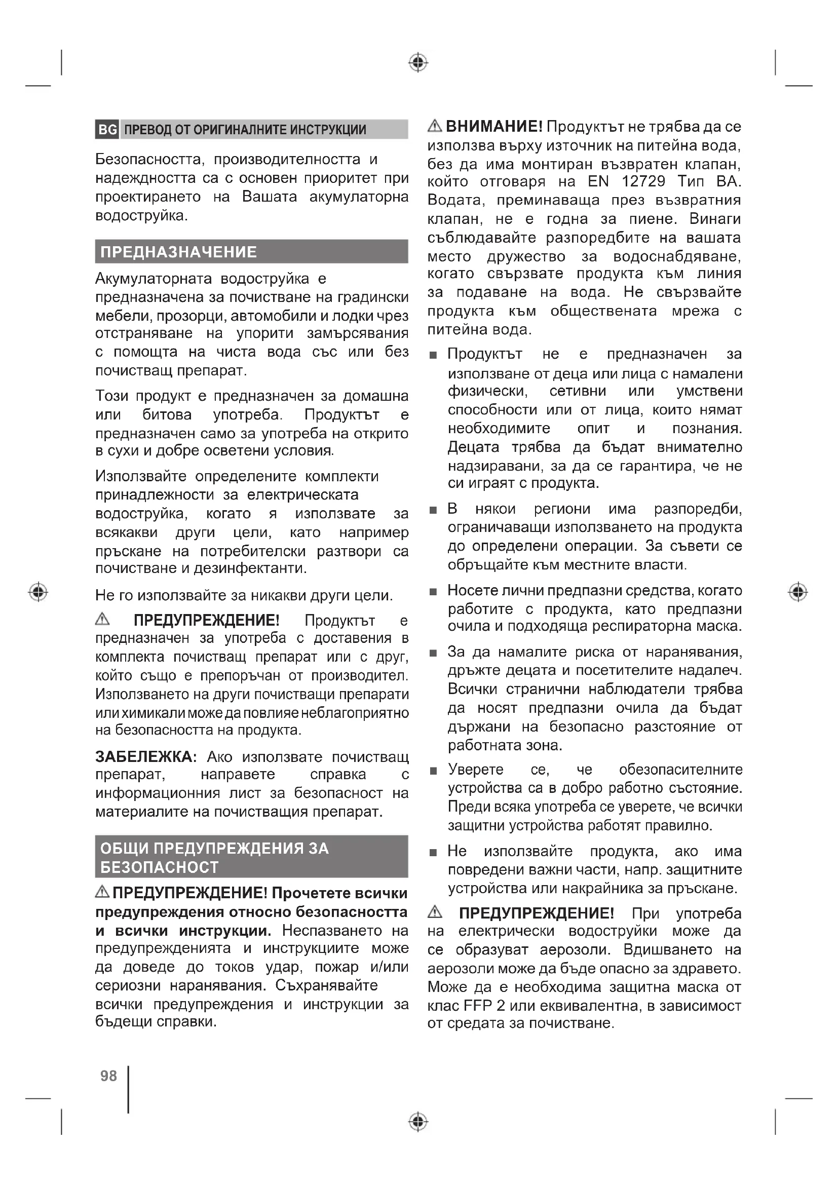 Използвайте определените комплекти принадлежности за електрическата водоструйка, когато я използвате за всякакви други цели, като например пръскане на потребителски разтвори са почистване и дезинфектанти. Не го използвайте за никакви други цели. ПРЕДУПРЕЖДЕНИЕ! Продуктът е предназначен за употреба с доставения в комплекта почистващ препарат или с друг, който също е препоръчан от производител. Използването на други почистващи препарати или химикали може да повлияе неблагоприятно на безопасността на продукта. ЗАБЕЛЕЖКА: Ако използвате почистващ препарат, направете справка с информационния лист за безопасност на материалите на почистващия препарат. ОБЩИ ПРЕДУПРЕЖДЕНИЯ ЗА БЕЗОПАСНОСТ ПРЕДУПРЕЖДЕНИЕ! Прочетете всички предупреждения относно безопасността и всички инструкции. Неспазването на предупрежденията и инструкциите може да доведе до токов удар, пожар и/или сериозни наранявания. Съхранявайте всички предупреждения и инструкции за бъдещи справки. ВНИМАНИЕ! Продуктът не трябва да се използва върху източник на питейна вода, без да има монтиран възвратен клапан, който отговаря на EN 12729 Тип BA. Водата, преминаваща през възвратния клапан, не е годна за пиене. Винаги съблюдавайте разпоредбите на вашата место дружество за водоснабдяване, когато свързвате продукта към линия за подаване на вода . Не свързвайте продукта към обществената мрежа с питейна вода. ■ Продуктът не е предназначен за използване от деца или лица с намалени физически, сетивни или умствени способности или от лица, които нямат необходимите опит и познания. Децата трябва да бъдат внимателно надзиравани, за да се гарантира, че не си играят с продукта. ■ В някои региони има разпоредби, ограничаващи използването на продукта до определени операции. За съвети се обръщайте към местните власти. ■ Носете лични предпазни средства, когато работите с продукта, като предпазни очила и подходяща респираторна маска. ■ За да намалите риска от наранявания, дръжте децата и посетителите надалеч. Всички странични наблюдатели трябва да носят предпазни очила да бъдат държани на безопасно разстояние от работната зона. ■ Уверете се, че обезопасителните устройства са в добро работно състояние. Преди всяка употреба се уверете, че всички защитни устройства работят правилно. ■ Не използвайте продукта, ако има повредени важни части, напр. защитните устройства или накрайника за пръскане. ПРЕДУПРЕЖДЕНИЕ! При употреба на електрически водоструйки може да се образуват аерозоли. Вдишването на аерозоли може да бъде опасно за здравето. Може да е необходима защитна маска от клас FFP 2 или еквивалентна, в зависимост от средата за почистване. 98ПРЕДУПРЕЖДЕНИЕ! Не въртете дюзата, докато дърпате спусъка. Ако тече вода, докато дюзата е обърната, тя се изпуска в предпазния канал. Това не е теч, но позволява на водата да излезе, без да повреди продукта. ПРЕДУПРЕЖДЕНИЕ! Струята под високо налягане е опасна, ако се не използва правилно. Не насочвайте струята към хора, електрическо оборудване под напрежение или към самия продукт. ■ За да избегнете риск от взрив, не пръскайте запалими течности. ■ Не насочвайте струята срещу себе си или други хора, за да чистите дрехи или