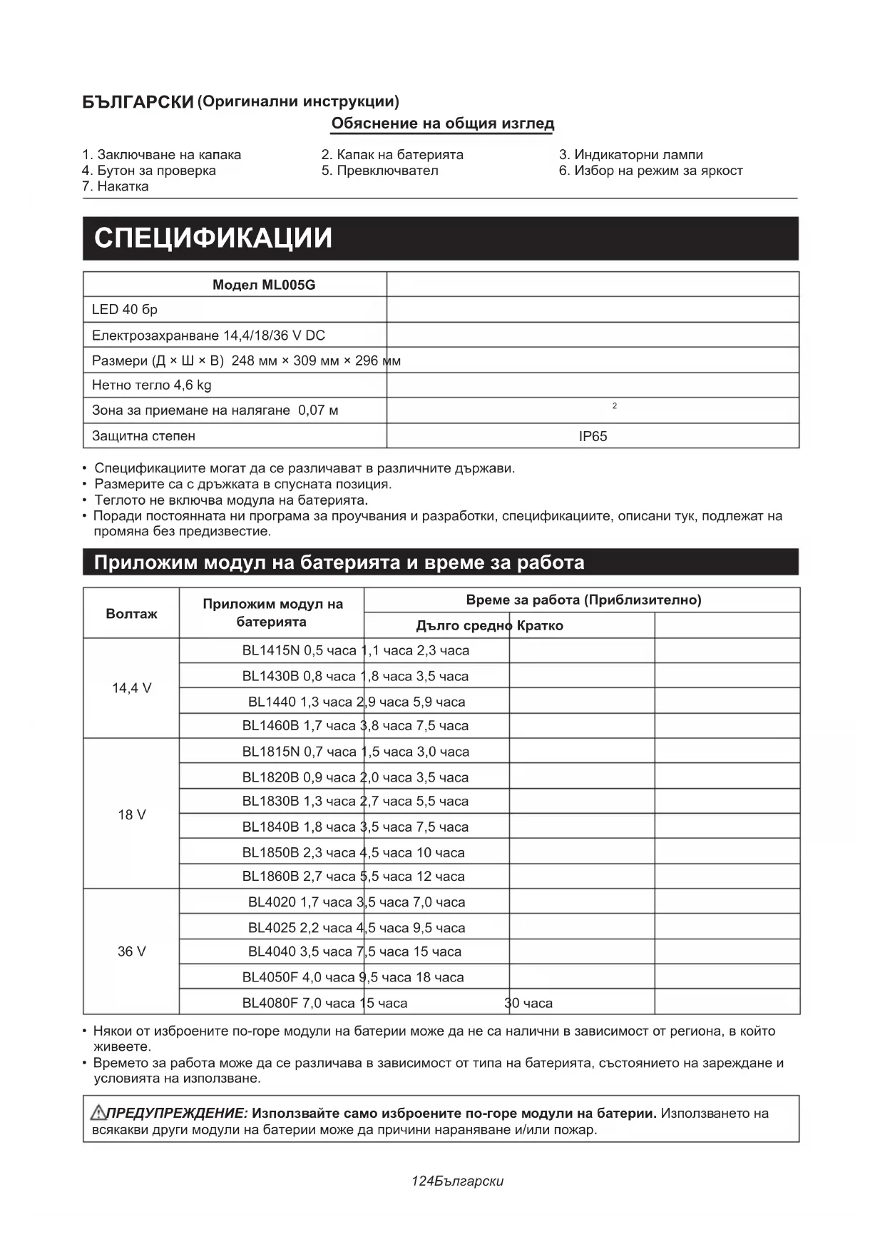 - Времето за работа може да се различава в зависимост от типа на батерията, състоянието на зареждане и условията на използване. ПРЕДУПРЕЖДЕНИЕ: Използвайте само изброените по-горе модули на батерии. Използването на всякакви други модули на батерии може да причини нараняване и/или пожар.125 Български