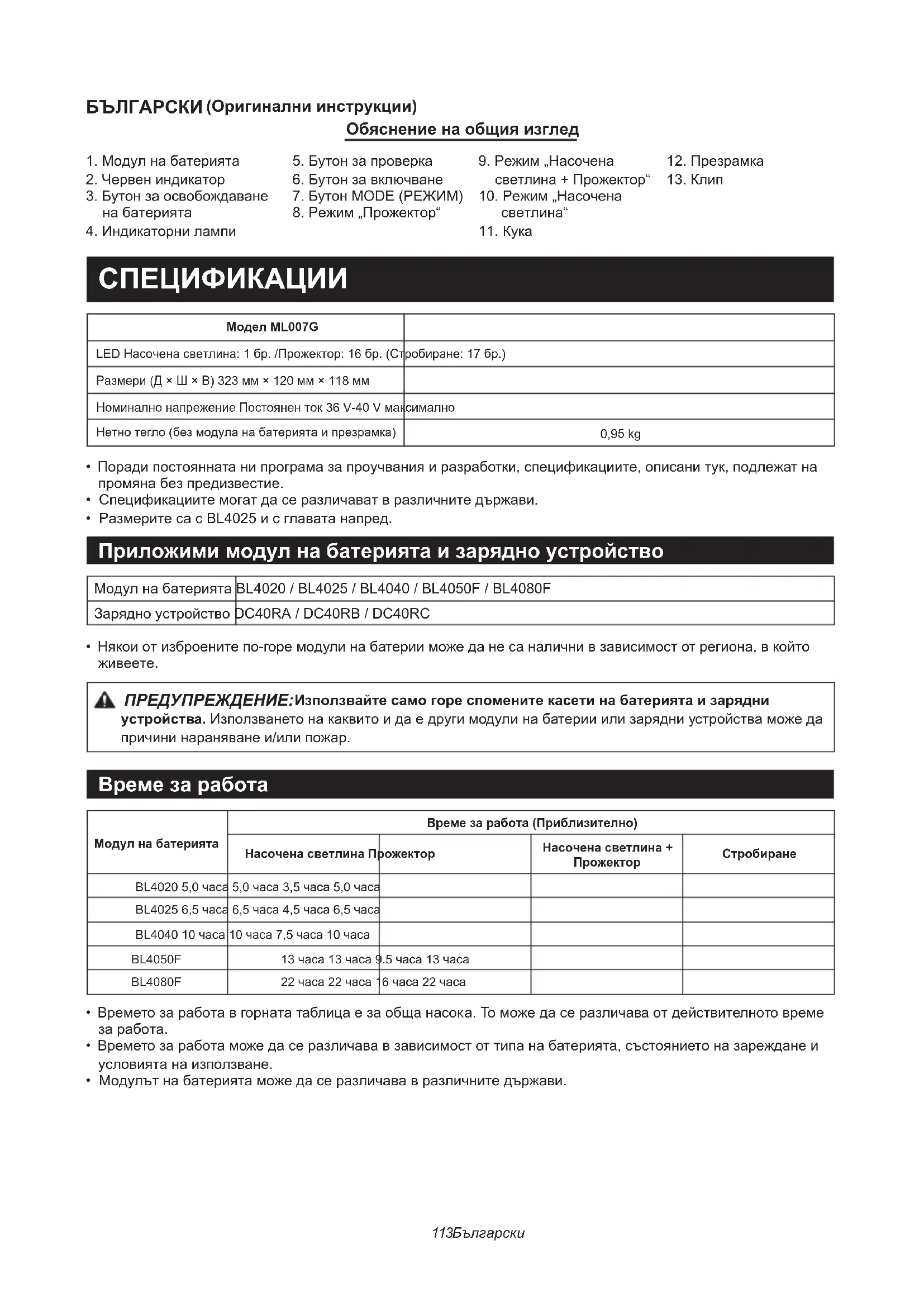 ПРЕДУПРЕЖДЕНИЕ: Използвайте само горе спомените касети на батерията и зарядни устройства. Използването на каквито и да е други модули на батерии или зарядни устройства може да причини нараняване и/или пожар. Време за работа Модул на батериятаВреме за работа (Приблизително)Насочена светлина ПрожекторНасочена светлина + ПрожекторСтробиранеBL4020 5,0 часа 5,0 часа 3,5 часа 5,0 часаBL4025 6,5 часа 6,5 часа 4,5 часа 6,5 часаBL4040 10 часа 10 часа 7,5 часа 10 часаBL4050F 13 часа 13 часа 9.5 часа 13 часаBL4080F 22 часа 22 часа 16 часа 22 часа