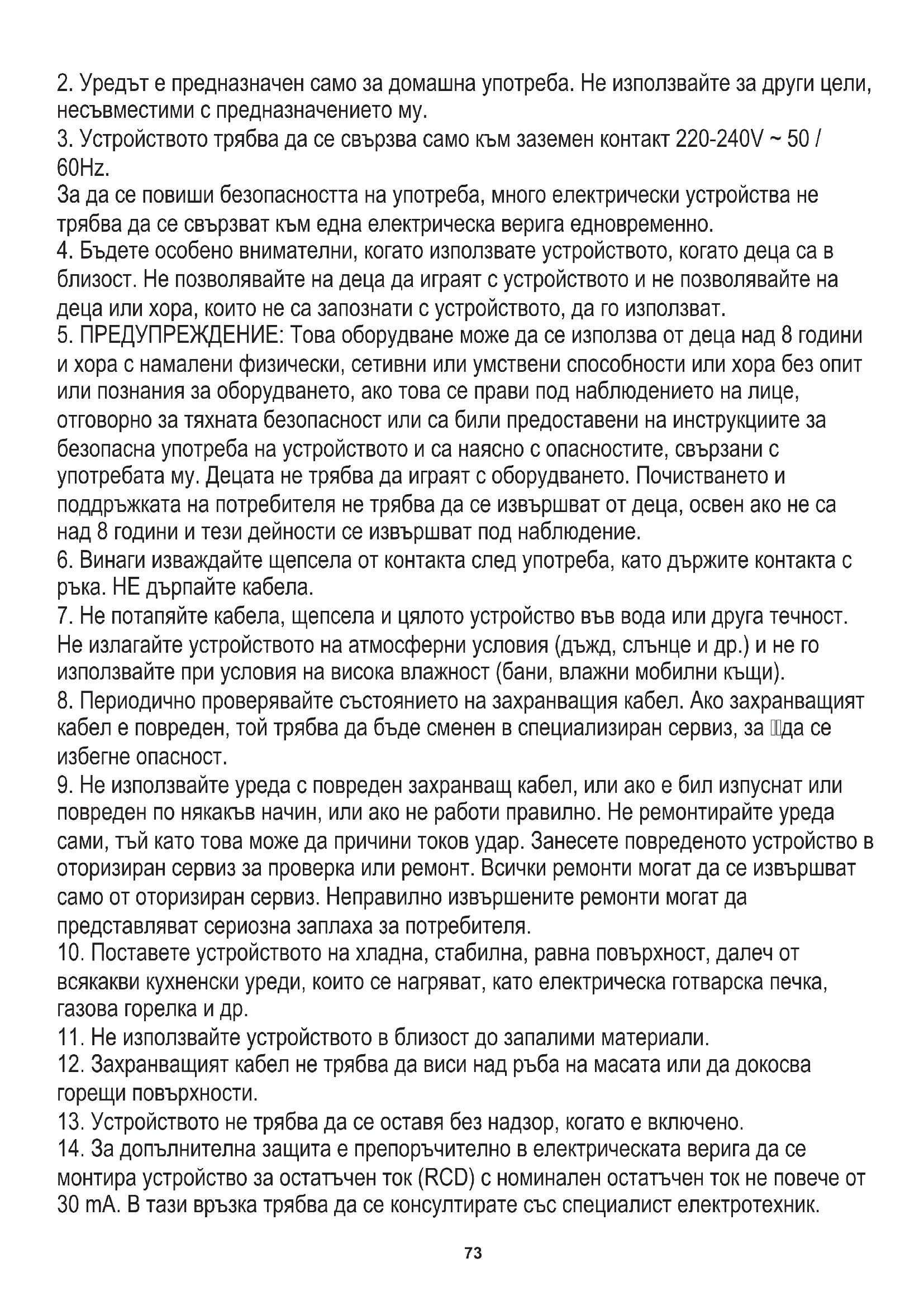 следвайте инструкциите, съдържащи се в тях. Производителят не носи отговорност за каквито и да било щети, причинени от употребата на уреда, противоречаща на предназначението му или неправилна експлоатация. ОБЩИ УСЛОВИЯ ЗА БЕЗОПАСНОСТ (BG) БЪЛГАРСКИ73