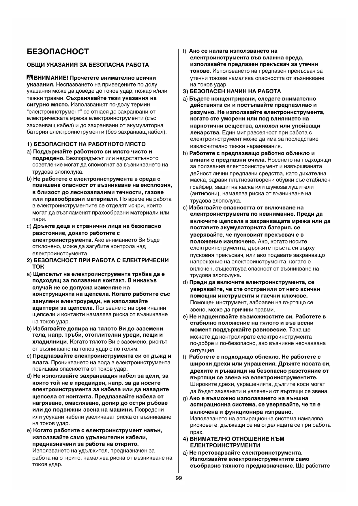 БЕЗОПАСНОСТ ОБЩИУКАЗАНИЯЗАБЕЗОПАСНАРАБОТА ВНИМАНИЕ!Прочететевнимателновсички указания. Неспазването на приведените по долу указания може да доведе до токов удар, пожар и/или тежки травми. Съхранявайтетезиуказанияна сигурномясто. Използваният по-долу термин “електроинструмент” се отнася до захранвани от електрическата мрежа електроинструменти (със захранващ кабел) и до захранвани от акумулаторна батерия електроинструменти (без захранващ кабел). 1)БЕЗОПАСНОСТНАРАБОТНОТОМЯСТО a) Поддържайтеработнотосимясточистои подредено. Безпорядъкът или недостатъчното осветление могат да спомогнат за възникването на трудова злополука. b) Неработетеселектроинструментавсредас повишенаопасностотвъзникваненаексплозия, вблизостдолеснозапалимитечности,газове илипрахообразниматериали. По време на работа в електроинструментите се отделят искри, които могат да възпламенят прахообразни материали или
