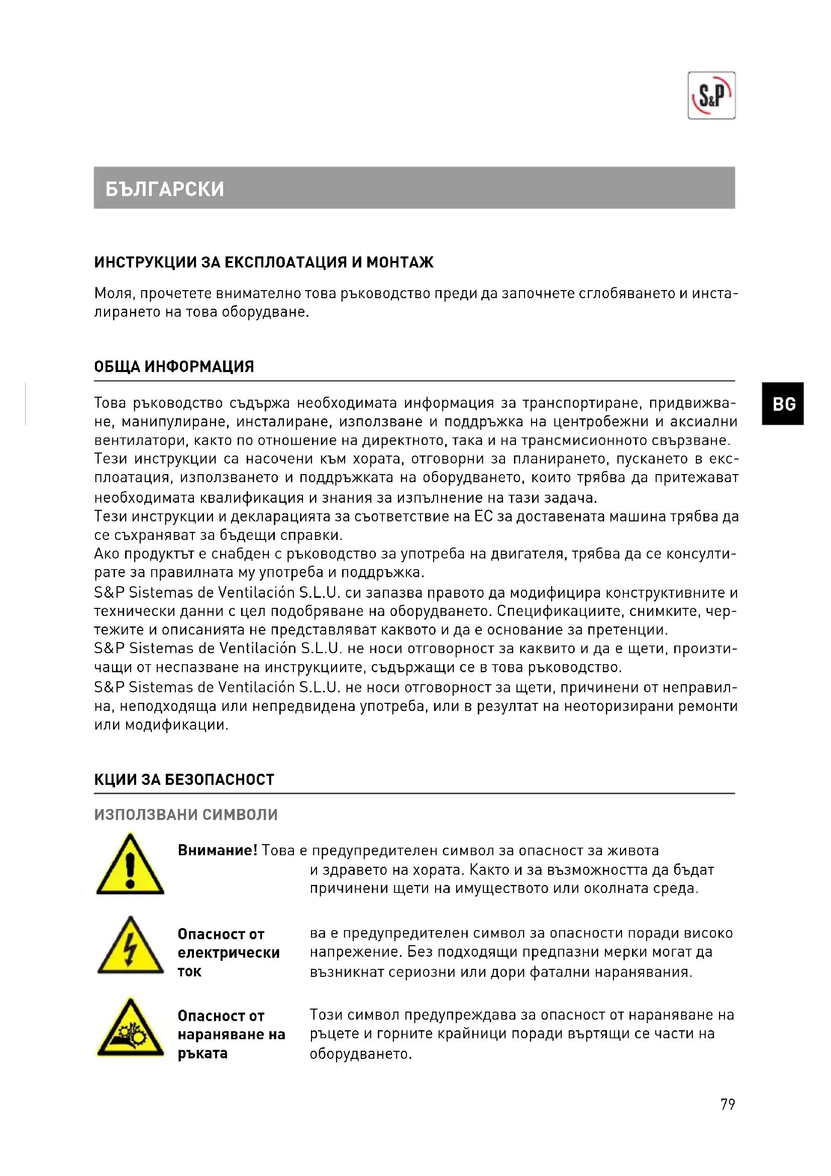 ИНСТРУКЦИИ ЗА ЕКСПЛОАТАЦИЯ И МОНТАЖ Моля, прочетете внимателно това ръководство преди да започнете сглобяването и инста- лирането на това оборудване. ОБЩА ИНФОРМАЦИЯ Това ръководство съдържа необходимата информация за транспортиране, придвижва- не, манипулиране, инсталиране, използване и поддръжка на центробежни и аксиални вентилатори, както по отношение на директното, така и на трансмисионното свързване. Тези инструкции са насочени към хората, отговорни за планирането, пускането в екс- плоатация, използването и поддръжката на оборудването, които трябва да притежават необходимата квалификация и знания за изпълнение на тази задача. Тези инструкции и декларацията за съответствие на ЕС за доставената машина трябва да се съхраняват за бъдещи справки. Ако продуктът е снабден с ръководство за употреба на двигателя, трябва да се консулти- рате за правилната му употреба и поддръжка. S&P Sistemas de Ventilación S.L.U. си запазва правото да модифицира конструктивните и технически данни с цел подобряване на оборудването. Спецификациите, снимките, чер- тежите и описанията не представляват каквото и да е основание за претенции. S&P Sistemas de Ventilación S.L.U. не носи отговорност за каквито и да е щети, произти- чащи от неспазване на инструкциите, съдържащи се в това ръководство. S&P Sistemas de Ventilación S.L.U. не носи отговорност за щети, причинени от неправил- на, неподходяща или непредвидена употреба, или в резултат на неоторизирани ремонти или модификации. КЦИИ ЗА БЕЗОПАСНОСТ ИЗПОЛЗВАНИ СИМВОЛИ Внимание! Това е предупредителен символ за опасност за живота и здравето на хората. Както и за възможността да бъдат причинени щети на имуществото или околната среда. Опасност от електрически