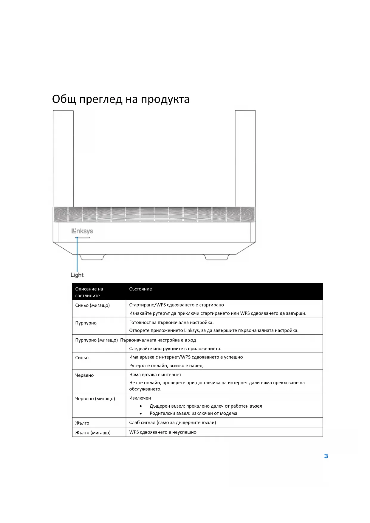 Готовност за първоначална настройка: Отворете приложението Linksys, за да завършите първоначалната настройка. Пурпурно (мигащо) Първоначалната настройка е в ход Следвайте инструкциите в приложението.