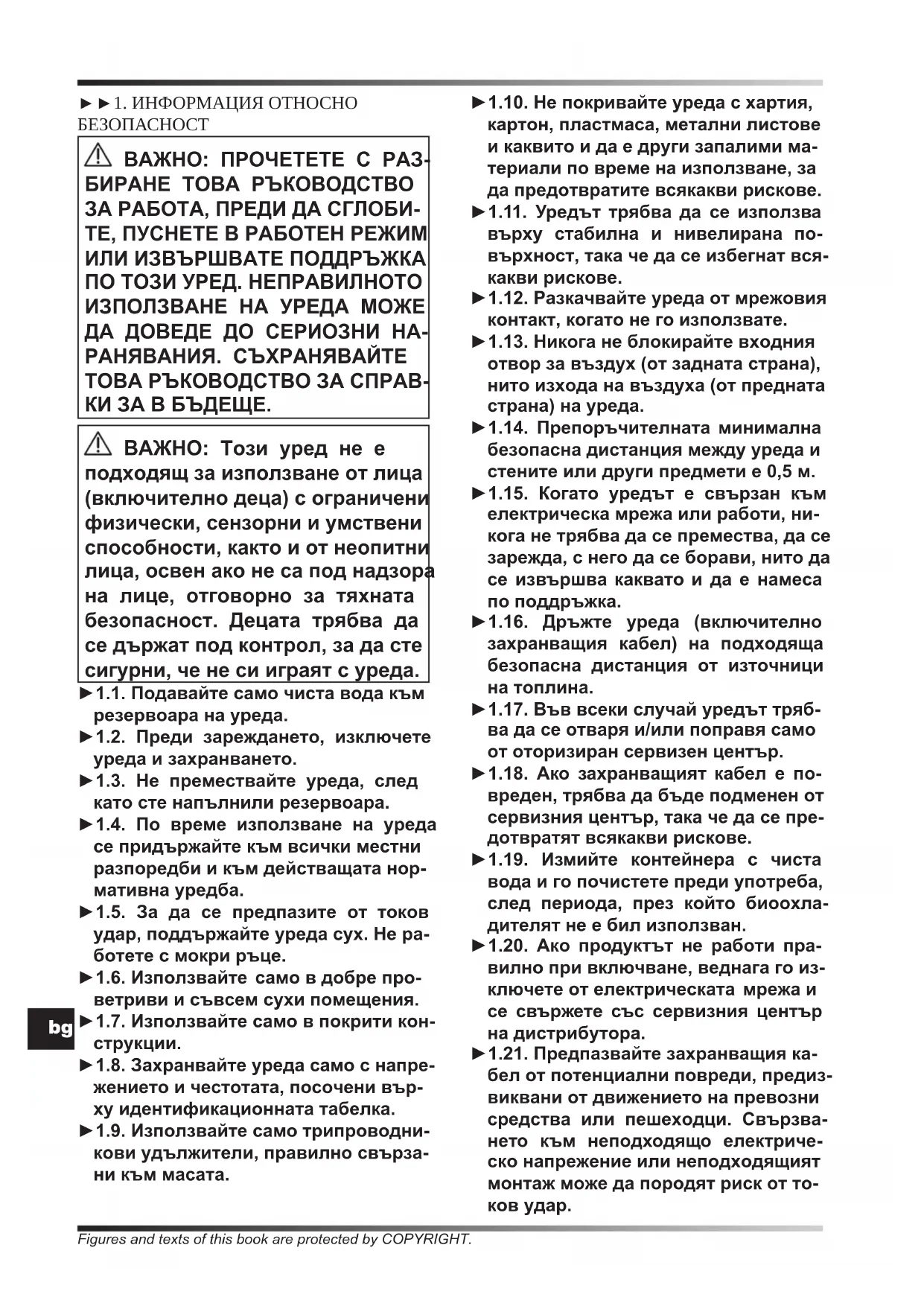►►1. ИНФОРМАЦИЯ ОТНОСНО БЕЗОПАСНОСT ВАЖНО: ПРОЧЕТЕТЕ С РАЗ- БИРАНЕ ТОВА РЪКОВОДСТВО ЗА РАБОТА, ПРЕДИ ДА СГЛОБИ- ТЕ, ПУСНЕТЕ В РАБОТЕН РЕЖИМ ИЛИ ИЗВЪРШВАТЕ ПОДДРЪЖКА ПО ТОЗИ УРЕД. НЕПРАВИЛНОТО ИЗПОЛЗВАНЕ НА УРЕДА МОЖЕ ДА ДОВЕДЕ ДО СЕРИОЗНИ НА- РАНЯВАНИЯ. СЪХРАНЯВАЙТЕ ТОВА РЪКОВОДСТВО ЗА СПРАВ- КИ ЗА В БЪДЕЩЕ. ВАЖНО: Този уред не е подходящ за използване от лица (включително деца) с ограничени физически, сензорни и умствени способности, както и от неопитни лица, освен ако не са под надзора на лице, отговорно за тяхната безопасност. Децата трябва да се държат под контрол, за да сте сигурни, че не си играят с уреда. ►1.1. Подавайте само чиста вода към резервоара на уреда. ►1.2. Преди зареждането, изключете уреда и захранването. ►1.3. Не премествайте уреда, след като сте напълнили резервоара. ►1.4. По време използване на уреда се придържайте към всички местни разпоредби и към действащата нор- мативна уредба. ►1.5. За да се предпазите от токов удар, поддържайте уреда сух. Не ра- ботете с мокри ръце. ►1.6. Използвайте само в добре про- ветриви и съвсем сухи помещения. ►1.7. Използвайте само в покрити кон-